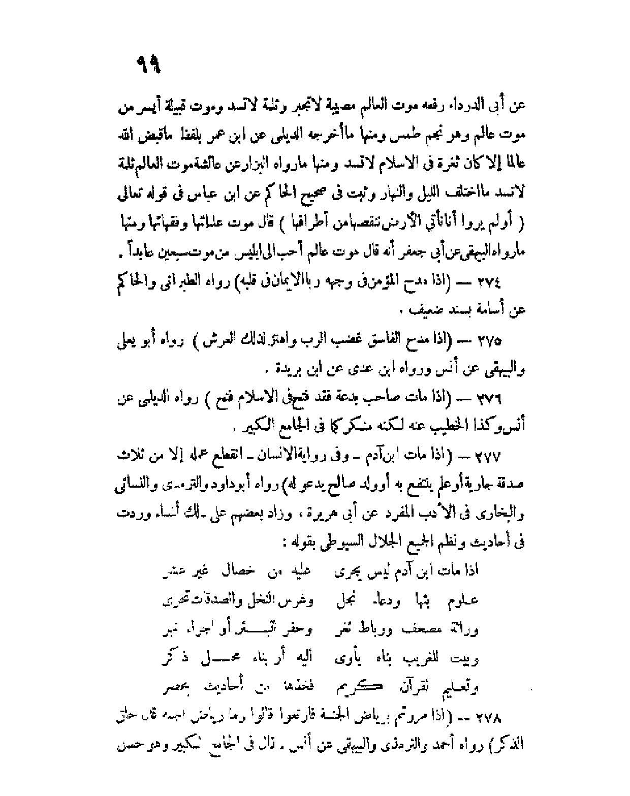 277 - (إذا مات ابنُ آدم - وفي رواية الإنسان - انقطعَ عملُه إلا مِن ثلاث صدقةٍ جارية أو علمٍ يُنتفع به أو ولدٍ صالح يدعو له) رواه أبو داود والترمذي والنسائي والبخاري في الأدب المفرد عن أبي هريرة، وزاد بعضهم على ذلك أشياء وردت في أحاديث ونظم الجميع الجلال السيوطي بقوله: