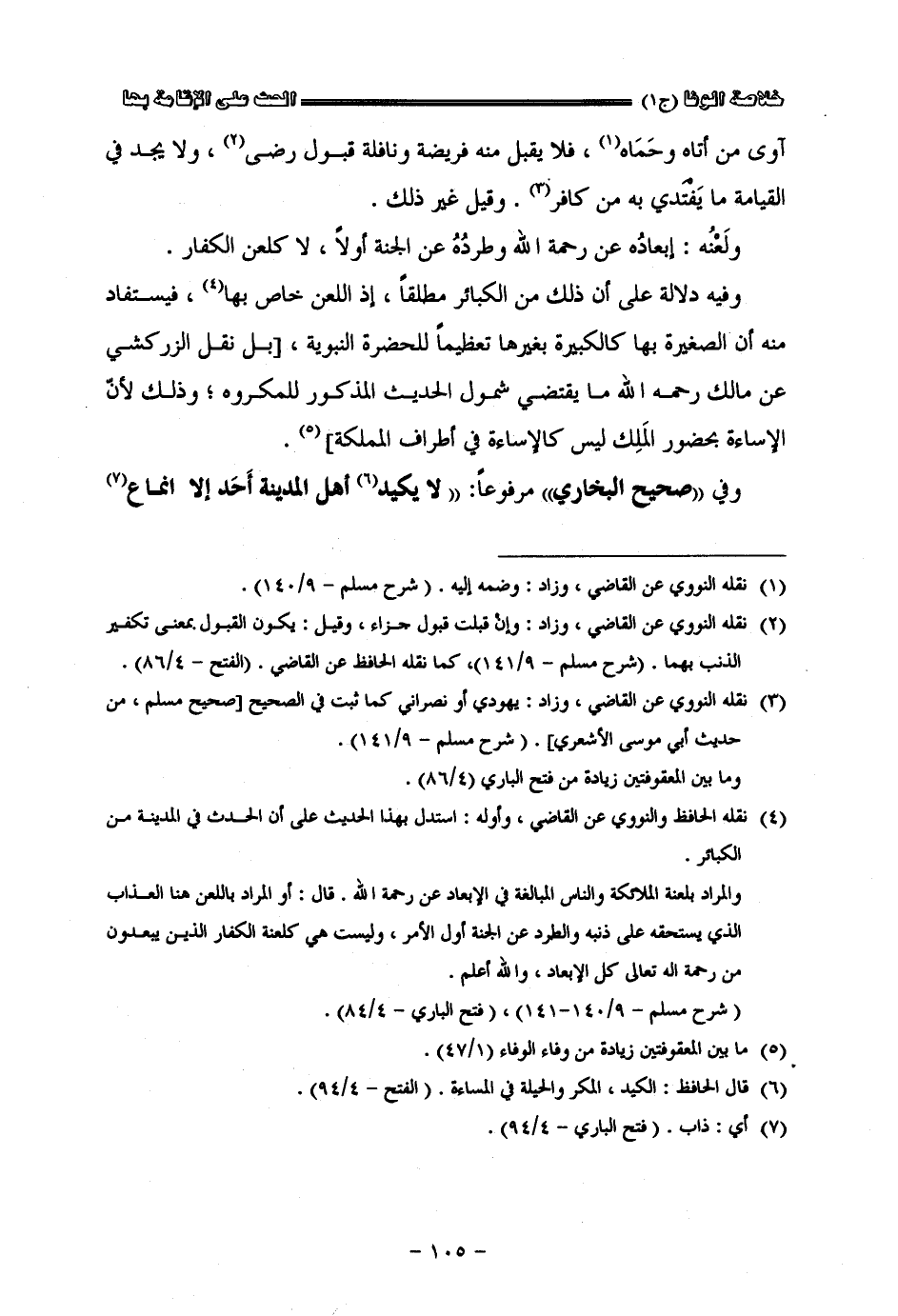 أو آوى من أتاه وحماه فلا يقبل منه فريضة ونافلة قبول رضا ولا يجد في القيامة ما يفتدى به من كافر وقيل غير ذلك ولعنه إبعاده عن رحمة الله وطرده عن الجنة أوّلا لا كلعن الكفار وفيه دلالة على أنّ ذلك من الكبائر مطلقا إذ اللعن خاص بها فيستفاد منه أنّ الصغيرة بها كالكبير بغيرها تعظيما للحضرة النبوية وفي صحيح البخاري مرفوعا لا يكيد أهل المدينة أحد إلا أنماع