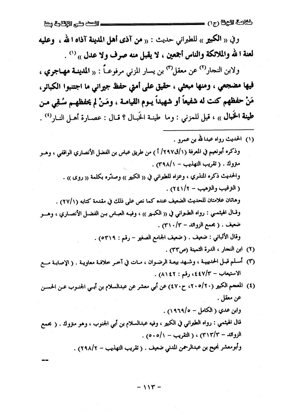 وفي الكبير للطبراني حديث من آذى أهل المدينة آذاه الله وعليه لعنة الله والملائكة والناس أجمعين لا يقبل منه صرف ولا عدل ولأبن النجار عن معقل بن يسار المزني مرفوعا المدينة مهاجري فيها مضجعي ومنها مبعثي حقيق على أمتي حفظ جيراني ما اجتنبوا الكبائر ومن حفظهم كنت له شفيعا أو شهيدا يوم القيامة ومن لم يحفظهم سقى من طينه الخبال قيل للمزني وما طينة الخبال قال عصارة أهل النار