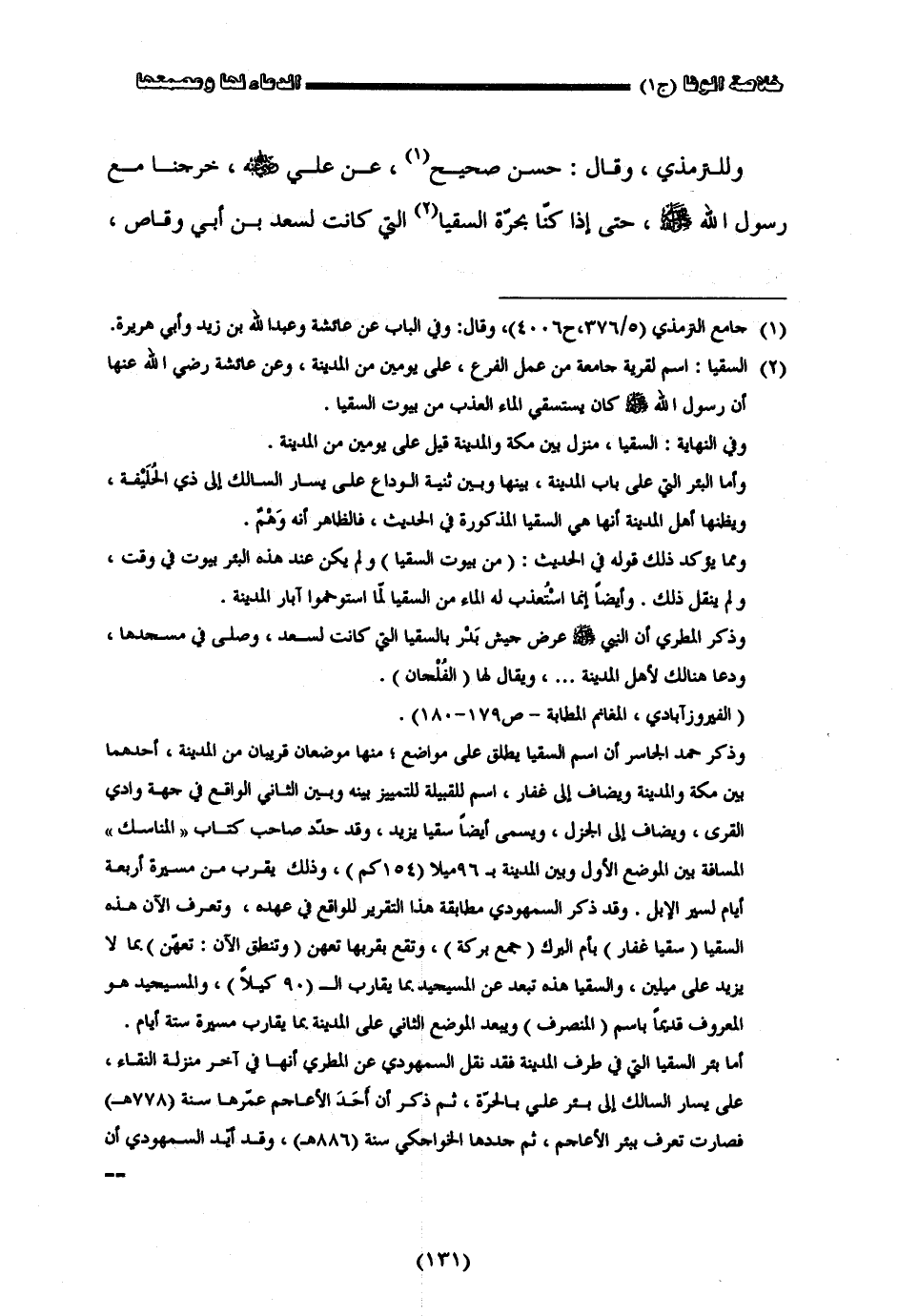 وللترمذي وقال حسن صحيح عن علي رضي الله عنه خرجنا مع رسول الله صلى الله عليه وسلم حتى إذا كنا بحرة السقيا التي كانت اسعد بن أبي وقاص