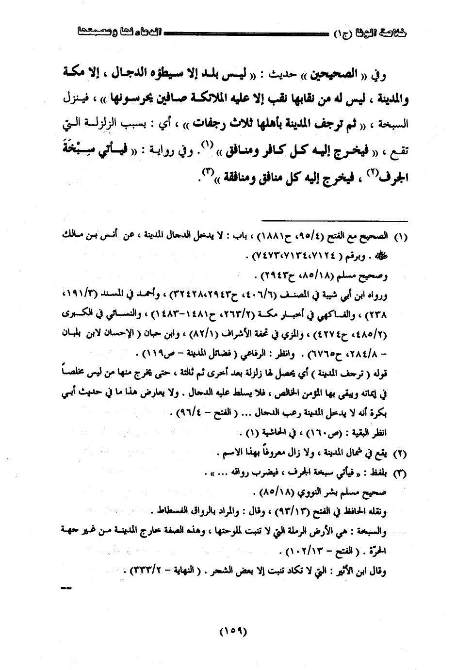وفي الصحيحين حديث ليس بلد إلا سيعلوه الجبال إلا مكة والمدينة ليس نقب من أنقابها إلا عليه ملائكة صافين يحرسونها فينزل السبخة ثم ترجف المدينة بأهلها ثلاث رجفات أي بسبب الزلزلة التي تقع فيخرج إليه كل كافر ومنافق وفي رواية فيأتي سبخة الجرف فيخرج إليه كل منافق ومنافقة