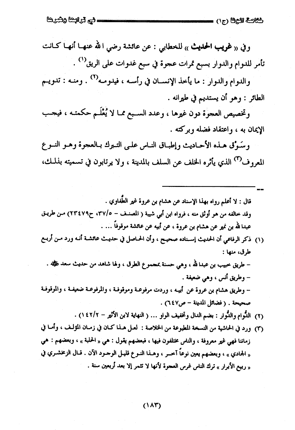 فيدومه ومنه تدويم الطائر وهو أن يستدير في طيرانه وتخصيص العجوة دون غيرها وعدد السبع مما لا يعلم حكمته فيجب الإيمان به واعتقاد فضله وبركته وسوق هذه الأحاديث وأطواق الناس على التبرك بالعجوة وهو النوع المعروف الذي يأثره الخلف عن السلف بالمدينة ولا يرتابون في تسميته بذلك يردّ ما قيل هنا مما سوى ذلك والعجوة كما قال أبن الأثير ضرب من التمر أكبر من الصيحاني يضرب إلى السواد قال وهو مما غرسه النبي صلى الله عليه وسلم بيده بالمدينة وذكر هذا الأخير البزار أيضا ولأبن حبان عن أبن عباس رضي الله عنه كان أحب التمر إلى رسول الله صلى الله عليه وسلم العجوة ولأحمد خير تمركم البراني يخرج الداء ولا داء فيه ورواه أبن شبة والحاكم خطابا لوفد عبد القيس في ثمارهم وللطبراني في الصغير برجال الصحيح كان رسول الله صلى الله عليه وسلم إذا أتى بالباكورة من الثمار ووضعها على عينيه ثم قال اللهم كما أطعمتنا أوله فأطعمنا آخره ثم يأمر به للمولود من أهله وفي الكبير كان إذا أتى بالباكورة من التمر قبلها وجعلها على عينيه وفي نوادر الأصول إذا أتى بالباكورة من كل شيء ثم قبلها ثم وضعها على عينيه اليمنى ثلاثا ثم اليسرى ثلاثا الحديث وللبزار مرفوعا يا عائشة إذا جاء الرطب فهنيني وفي الغيلانيات كان رسول الله صلى الله عليه وسلم يعجبه أن يفطر على الرطب في أيام الرطب وعلى التمر إذا لم يكن رطب ويختم بهن ويجعلهن وترا ثلاثا أو خمسا أو سبعا وأنواع تمر المدينة كثيرة استقصيناها في الأصل الأول فبغلت مائة وبضعا وثلاثين نوعا منها الصيحاني وفي فضل أهل البيت لأبن المؤيد الحموي عن جابر رضي الله عنه قال كنت مع النبي صلى الله عليه وسلم يوما في بعض حيطات المدينة ويد عليّ في يده قال فمررنا بنخل فصاح النخل هذا محمد سيد الأنبياء وهذا عليّ سيد الأولياء أبو الأئمة الطاهرين ثم مررنا بنخل فصاح النخل هذا محمد رسول الله صلى الله عليه وسلم وهذا عليّ سيف الله فلتفت النبي صلى الله عليه وسلم إلى عليّ فقال له سمه الصيحاني فسمى من ذلك اليوم الصيحاني فكان هذا سبب تسمية هذا النوع بذلك أو المراد نخل ذلك الحائط وبالمدينة اليوم موضع يعرف بالصيحاني. هـ ومنه تدويم الطائر وهو أن يستدير في طيرانه وتخصيص العجوة دون غيرها وعدد السبع مما لا يعلم حكمته فيجب الإيمان به واعتقاد فضله وبركته وسوق هذه الأحاديث وأطواق الناس على التبرك بالعجوة وهو النوع المعروف الذي يأثره الخلف عن السلف بالمدينة ولا يرتابون في تسميته بذلك