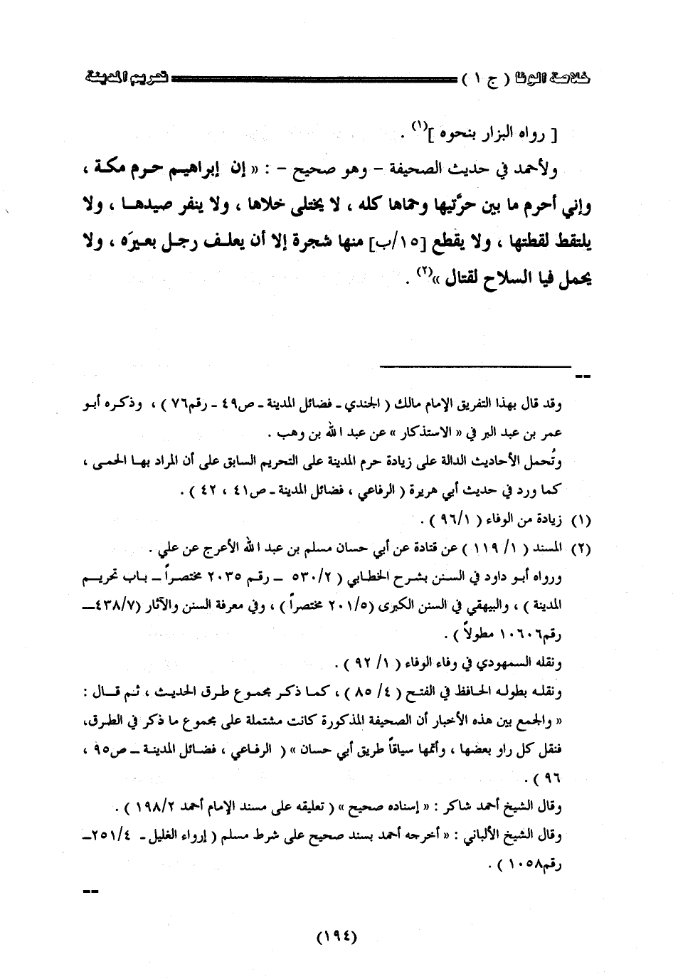 ولأحمد في حديث الصحيفة وهو صحيح إن إبراهيم حرم مكة وأنا أحرم ما بين حرتيها وحماها كله لا يختلي خلاها ولا ينفر صيدها ولا يلتقط لقطتها ولا يقطع منها شجرة إلا أن يعلف رجل بعيره ولا يحمل فيها السلاح لقتال
