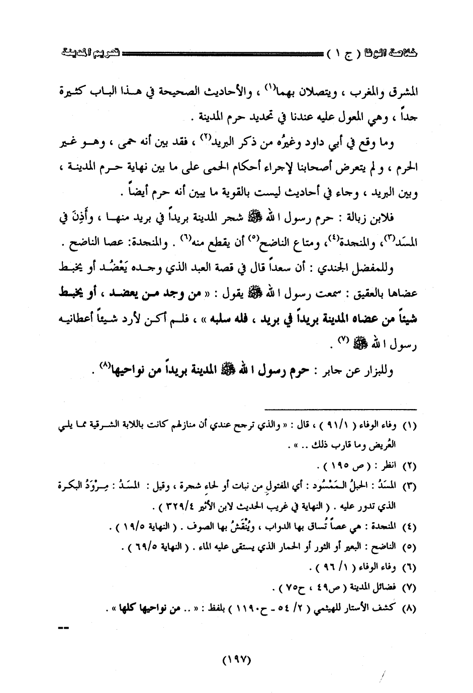 المشرق والمغرب ويتصلان بهما والأحاديث الصحيحة في هذا الباب كثيرة جدّا وهي المعول عليه عندنا في تحديد حرم المدينة وما وقع في أبي داود وغيره من ذكر البريد فقد بين إنه حمى وهو غير الحرم ولم يتعرض أصحابنا لإجراء أحكام الحمى على ما بين نهاية حرم المدينة وبين البريد وجاء في أحاديث ليست بالقوية ما يبين أنه حرم أيضا فلأبن زبالة حرم رسول الله صلى الله عليه وسلم شجر المدينة بريدا في بريد منها وأذن في المسد والنجدة ومتاع الناضح أن يقطع منه والمنجدة عصا الناضح وللمفضل الجندي أن سعدا قال في قصة العبد الذي وجده يعضد أو يخبط شيئاً من عضاه بالعقيق سمعت رسول الله صلى الله عليه وسلم يقول من وجد من يعضد أو يخبط شيئاً من عضاه المدينة بريدا في بريد فله سلبه فلم أكن لأردّ شيئاً أعطانيه رسول الله صلى الله عليه وسلم وللبزار عن جابر حرّم