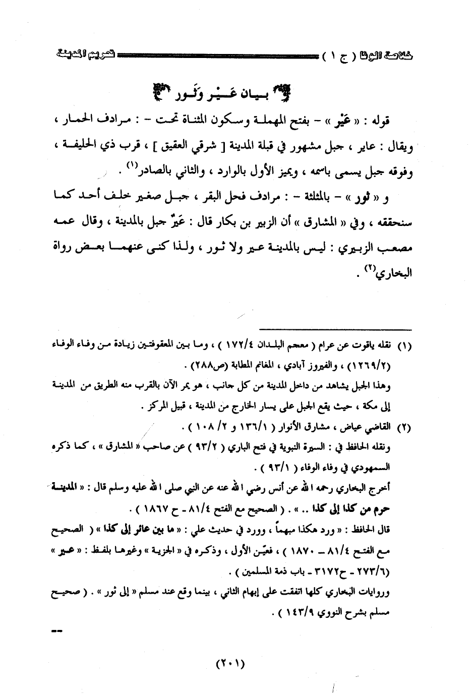 قوله عير لفتح المهملة وسكون المثناة تحت مرادف الحمار ويقال عاير جبل مشهور في قبلة المدينة قرب ذي الحليفة وفوقه جبل يسمى باسمه ويميز الأوّل بالوارد والثاني بالصادر وثور بالمثلثة مرادف فحل البقر جبل صغير خلف أحد كما سنحققه وفي المشارق أنّ الزبير بن بكار قال عير جبل المدينة وقال عمه مصعب الزبيري ليس بالمدينة عير ولا ثور ولذا كنى عنهما بعض رواة البخاري