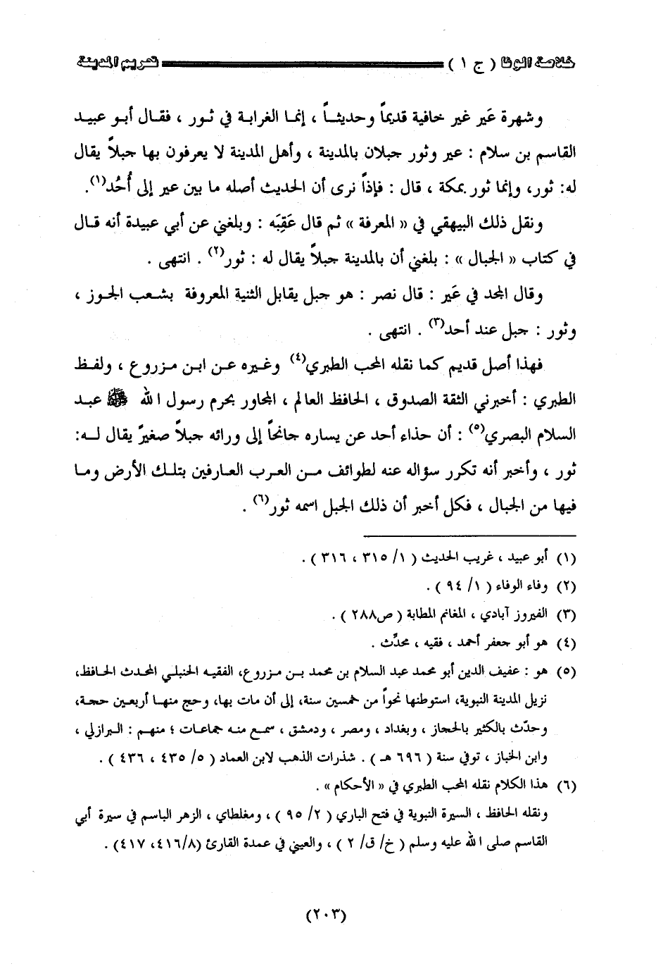 وشهرة عير غير خافية قديما وحديثا إنما الغرابة في ثور فقال أبو عبيد القاسم بن سلام عير وثور جبلان بالمدينة وأهل المدينة لا يعرفون بها جبلا يقال له ثور وإنما ثور بمكة قال فإذا نرى أنّ الحديث أصله ما بين عير إلى أحد ونقل ذلك البيهقي في المعرفة ثم قال عقبه وبلغني عن أبي عبيدة إنه قال في كتاب الجبال بلغني أن بالمدينة جبلا يقال له ثور انتهى وقال المجد في عير قال نصر هو جبل يقابل الثنية المعروفة بشعب الجوز وثور جبل عند أحد انتهى فهذا أصل قديم كما نقله المحب الطبريّ وغيره عن أبن مزروع ولفظ الطبريّ أخبرني الثقة الصدوق الحافظ العالم المجاور بحرم رسول الله صلى الله عليه وسلم البصري إن حذاء أحد عن يساره جافحا إلى ورائه جبلا صغيرا يقال له ثور وأخبر أنه تكرر سؤاله عن الطوائف من العرب العارفين بتلك الأرض وما فيها من الجبال فكل أخبر أن ذلك الجبل اسمه ثور