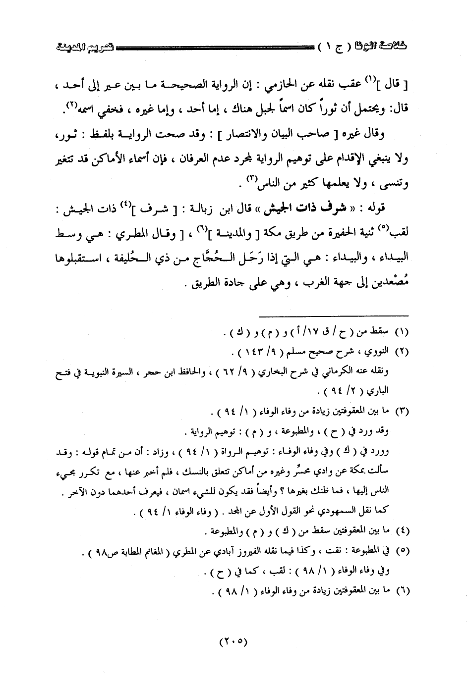 عقب نقله عن الحازمي أن الرواية الصحيحة ما بين عير إلى أحد قال ويحتمل أن ثورا كان اسما الجبل هناك أما أحد وأما غيره فحق اسمه وقال غيره فقد سمعت الرواية بلفظ ثورا ولا ينبغي الأقدام على توهيم الرواية لمجرد عدم العرفان فإن أسماء الأماكن قد تتغير أو تنسى ولا يعلمها كثير من الناس قوله شرف ذات الجيش قال ابن زبالة ذات الجيش نقيب ثنية الحفيرة من طريق مكة
