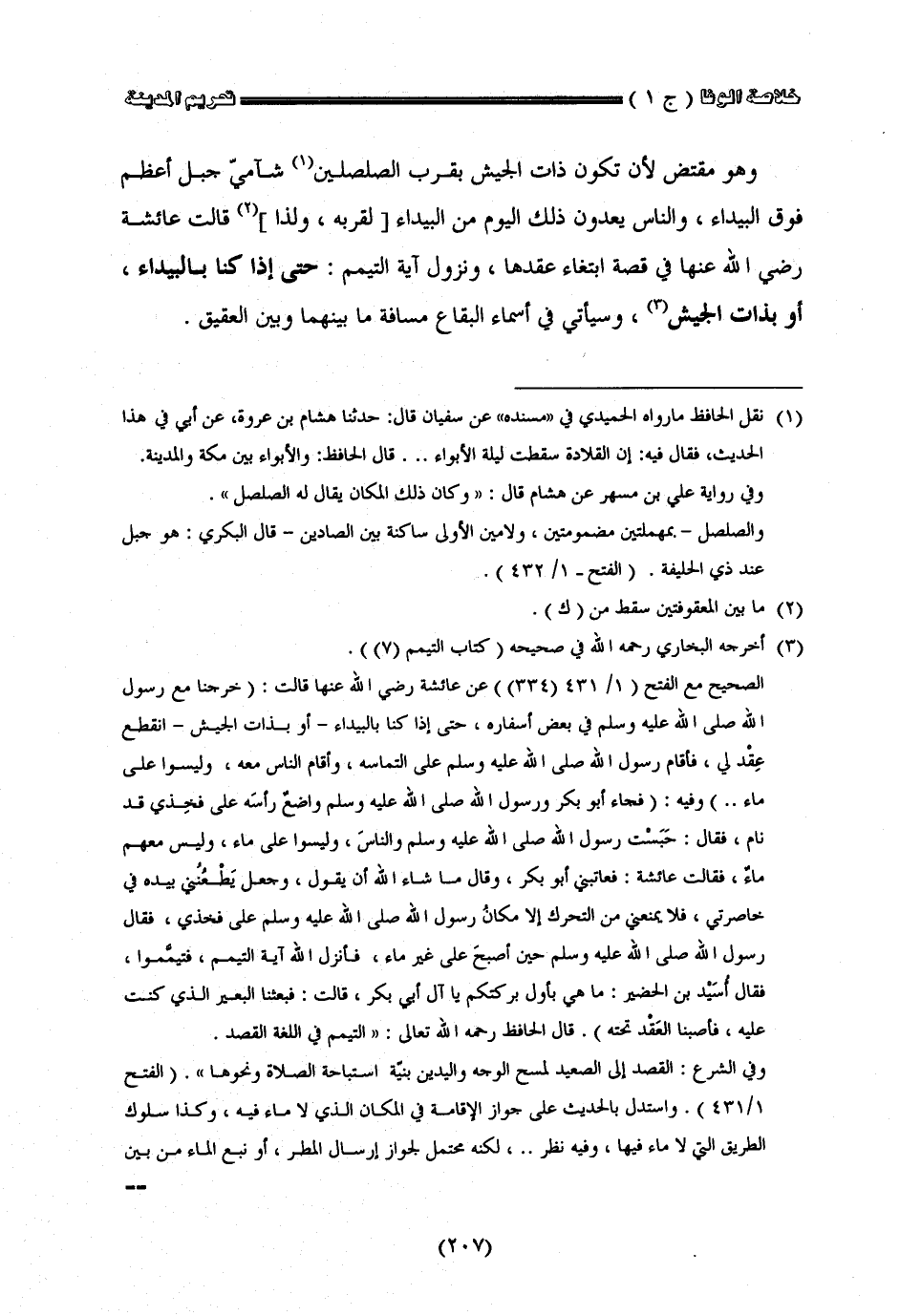 وهو مقتض لأن تكون ذات الجيش بقرب الصلصلين شاميّ جبل أعظم فوق البيداء والناس يعدون ذلك اليوم من البيداء لقربه ولذا قالت عائشة رضي الله عنها في قصة ابتغاء عقدها ونزول آية التميم حتى إذا كنا بالبيداء أو بذات الجيش وسيأتي في أسماء البقاع مسافة ما بينهما وبين العقيق