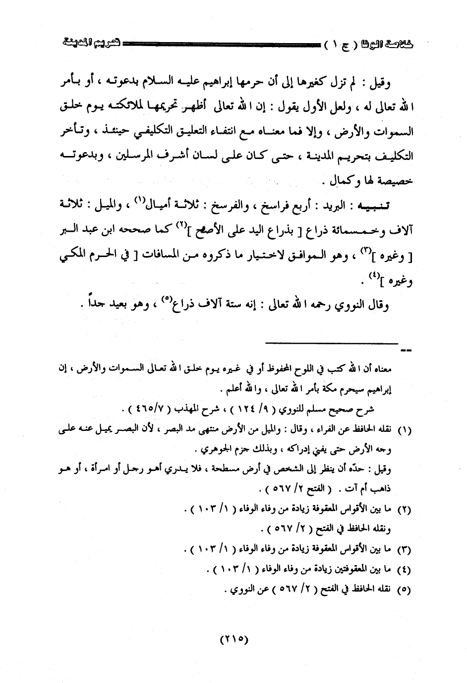 وقيل لم تزل كغيرها إلى أن حرمها إبراهيم عليه السلام بدعوته أو بأمر الله تعالى له ولعل الأول يقول أن الله تعالى أظهر تحريمها الملائكة يوم خلق السماوات والأرض وإلا فما معناه مع انتفاء التعليق التكليفي حينئذ وتأخر التكليف بتحريم المدينة حتى كان على لسان اشرف المرسلين بدعوته خصيصة لها وكمال " تنبيه " البريد أربع فراسخ والفرسخ ثلاثة أميال والميل ثلاثة آلاف وخمسمائة ذراع كما صححه ابن عبد البر وهو الموافق لاختيار ما ذكروه من المسافات وقال النووي رحمه الله تعالى أنه ستة آلاف ذراع وهو بعيد جدا