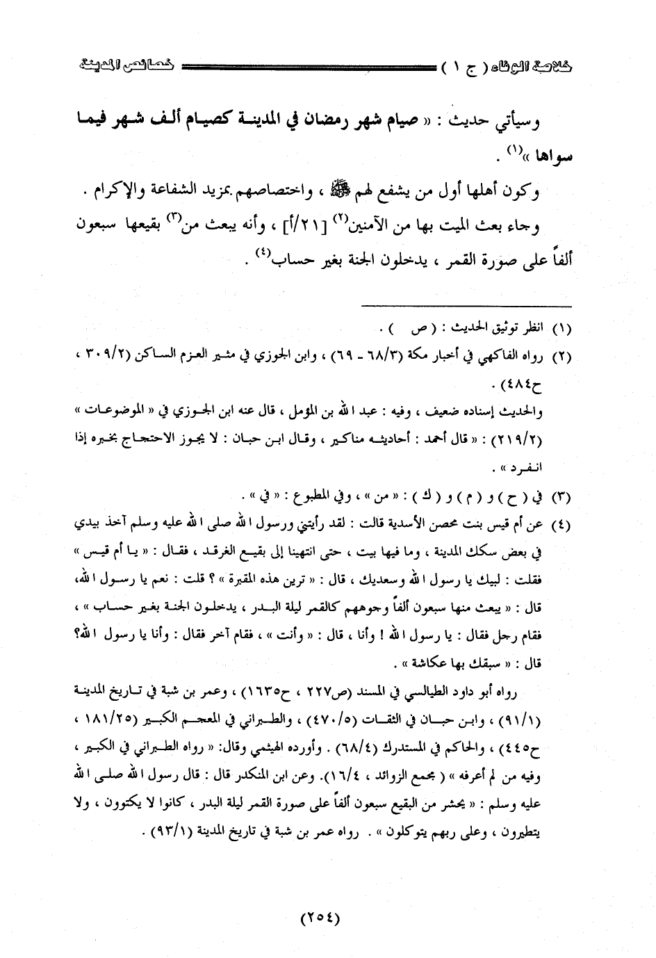وسيأتي حديث صيام شهر رمضان في المدينة كصيام ألف شهر فيما سواها وكون أهلها أول من يشفع لهم صلى الله عليه وسلم واختصاصهم بمزيد الشفاعة والإكرام وجاء بعث الميت بها من الآمنين وأنه يبعث من بقيعها سبعون ألفا على صورة القمر يدخلون الجنة بغير حساب