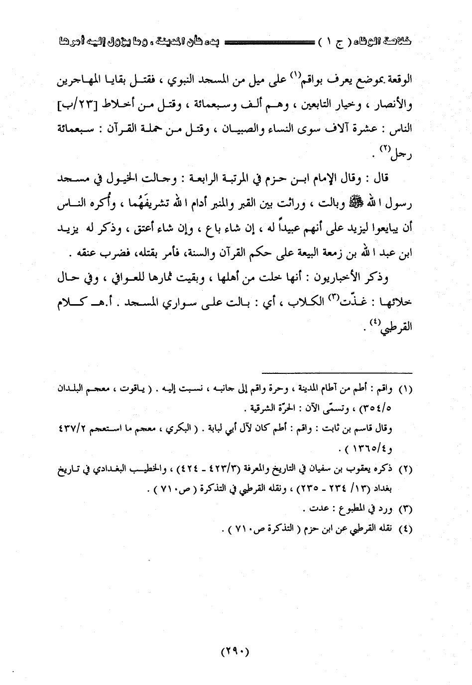 الوقعة بموضع يعرف بواقم على ميل من المسجد النبوي فقتل بقايا المهاجرين والأنصار وخيار التابعين وهم ألف وسبعمائة وقتل من أخلاط الناس عشرة آلاف سوى النساء والصبيان وقتل من حملة القرآن سبعمائة رجل قال وقال الإمام بن حزم في المرتبة الرابعة وجالت الخيول في مسجد رسول الله صلى الله عليه وسلم وبالت وراثت بين القبر والمنبر أدام الله تشريفهما وأكره الناس أن يبايعوا اليزيد على أنهم عبيد له إن شاء باع وإن شاء أعتق وذكر له يزيد بن عبد الله بن زمعة البيعة على