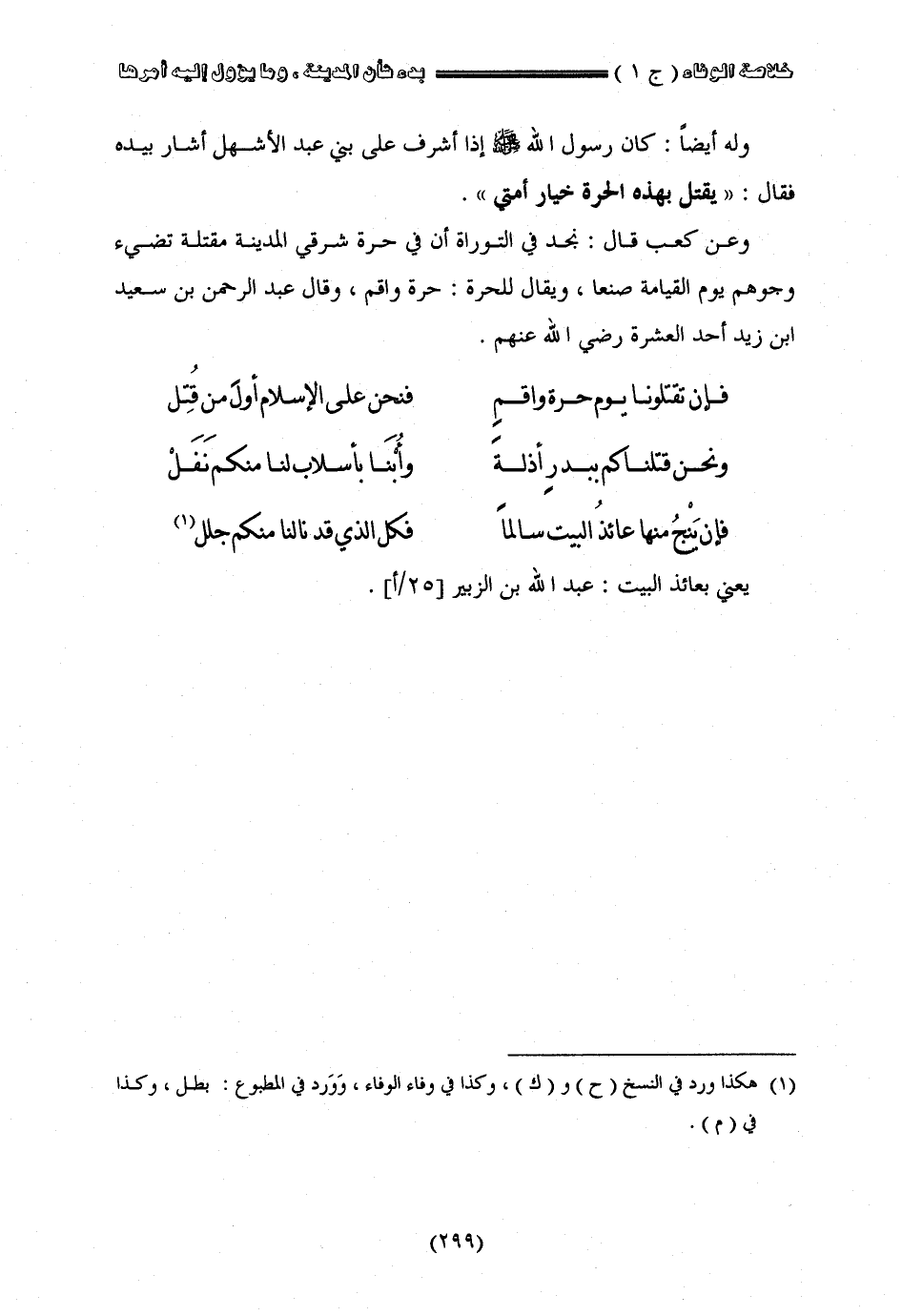 وله أيضا كان رسول الله صلى الله عليه وسلم إذا أشرف على بني عبد الأشهل أشار بيد فقال يقتل بهذه الحرّة خيار أمّتي وعن كعب قال نجد في التوراة إن في حرة شرقي المدينة مقتلة تضيء وجوههم يوم القيامة صنعا ويقال للحرة حرة وأقم وقال عبد الرحمن بن سعيد بن زيد أحد العشرة