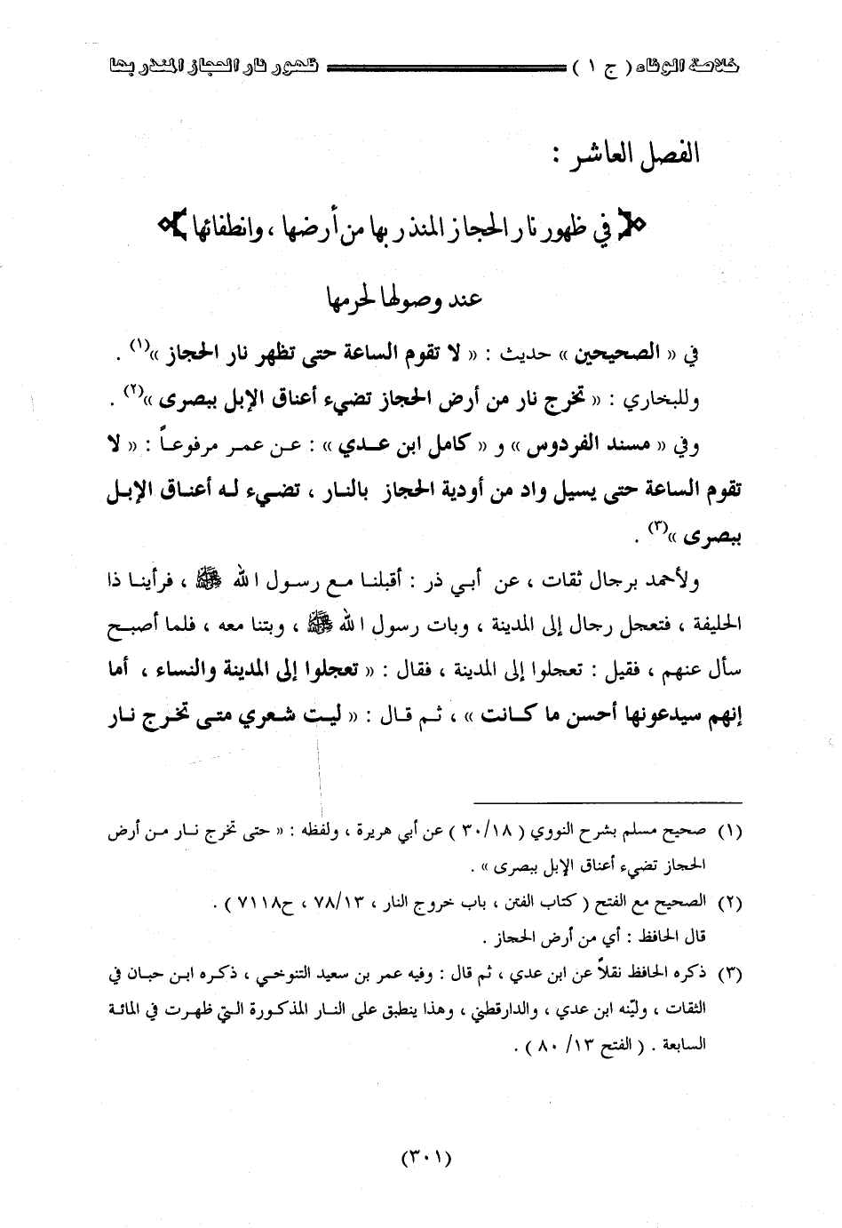" الفصل العاشر " في ظهور نار الحجاز المنذر بها من أرضها وانطفائها عند وصولها لحرمها