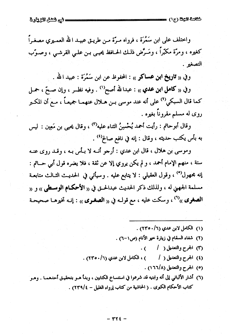 واختلف علي بن سمرة فرواه مرة من طريق عبيد الله العمريّ مصغرا كغيره ومرة مكبرا ومرّ من ذلك الحافظ يحيى بن عليّ القرشي وصوّب التصغير وفي تاريخ أبن عساكر المحفوظ عن أبن سمرة عبيد الله وفي كامل أبن عدي عبد الله أصح وفيه نظر وأن صح حمل كما قال السبكيّ على إنه عند موسى بن هلال عنهما جميعا مع إنّ المكبر روى له مسلم مقرونا بغيره وقال أبو حاتم رأيت أحمد يحسن الثناء عليه وقال يحيى بن معين ليس به بأس يكتب حديثه وقال إنه في نافع صالح وموسى بن هلال قال أبن عدي أرجو إنه لا بأس به وقد روى عنه ستة منهم الإمام أحمد ولم يكن يروي إلا عن ثقة فلا يضره قول أبي حاتم إنه مجهول وقول العقيلي لا يتابع عليه وسيأتي في الحديث الثالث متابعة مسلمة الجهني له ولذلك ذكر هذا الحديث عبد الحق في الأحكام الوسطى والصغرى وسكت عليه مع قوله في الصغرى إنه تخيرها صحيحة
