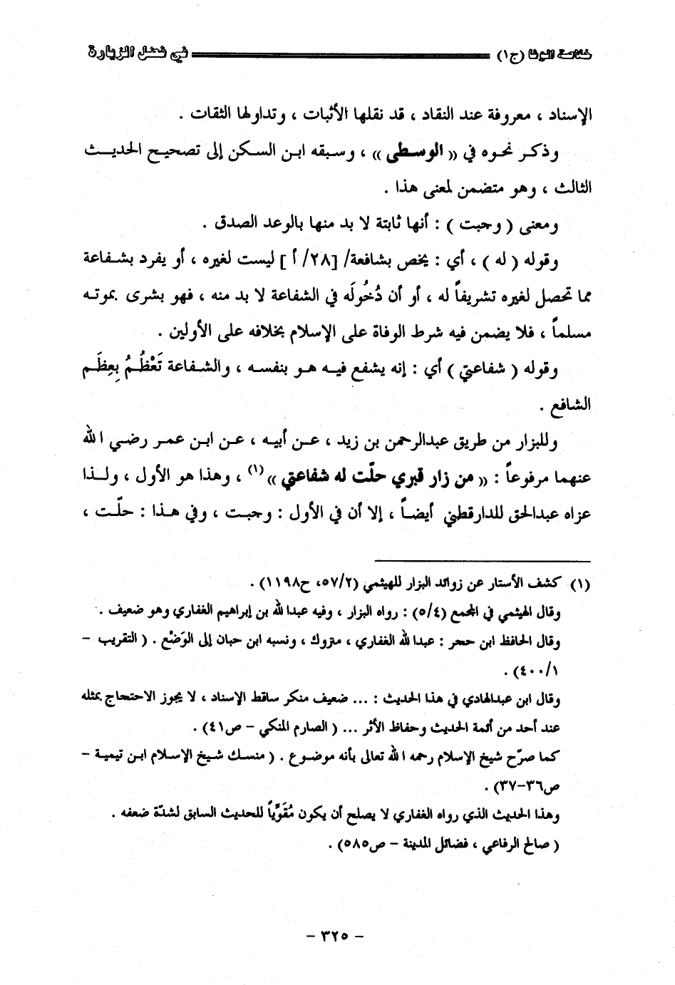 الإسناد معروفة عند النقاد قد ثقلها الإثبات وتداولها الثقات وذكر نحوه في الوسطى وسبقه إبن السكن إلى تصحيح الحديث الثالث وهو متضمن لمعنى هذا ومعنى وجبت إنها ثابتة لا بدّ منها بالوعد الصدق وقوله له أي يخص بشفاعة ليست لغيره أو يفرد بشفاعة مما تحصل لغيره تشريفا له أو أن دخوله في الشفاعة لا بدّ منه فهو بشرى بموته مسلما فلا يضمن فيه شرط الوفاة على الإسلام بخلافه على الأوّلين وقوله شفاعتي أي إنه يشفع فيه هو بنفسه والشفاعة تعظم بعظم الشافع وللبزار من طريق عبد الرحمن بن زيد عن أبيه عن أبن عمر رضي الله عنه مرفوعا من زار قبري حلت له شفاعتي وهذا هو الأوّل ولذا عزاه عبد الحق للدارقطني أيضا إلا أن في الأوّل وجبت وفي هذا حلت