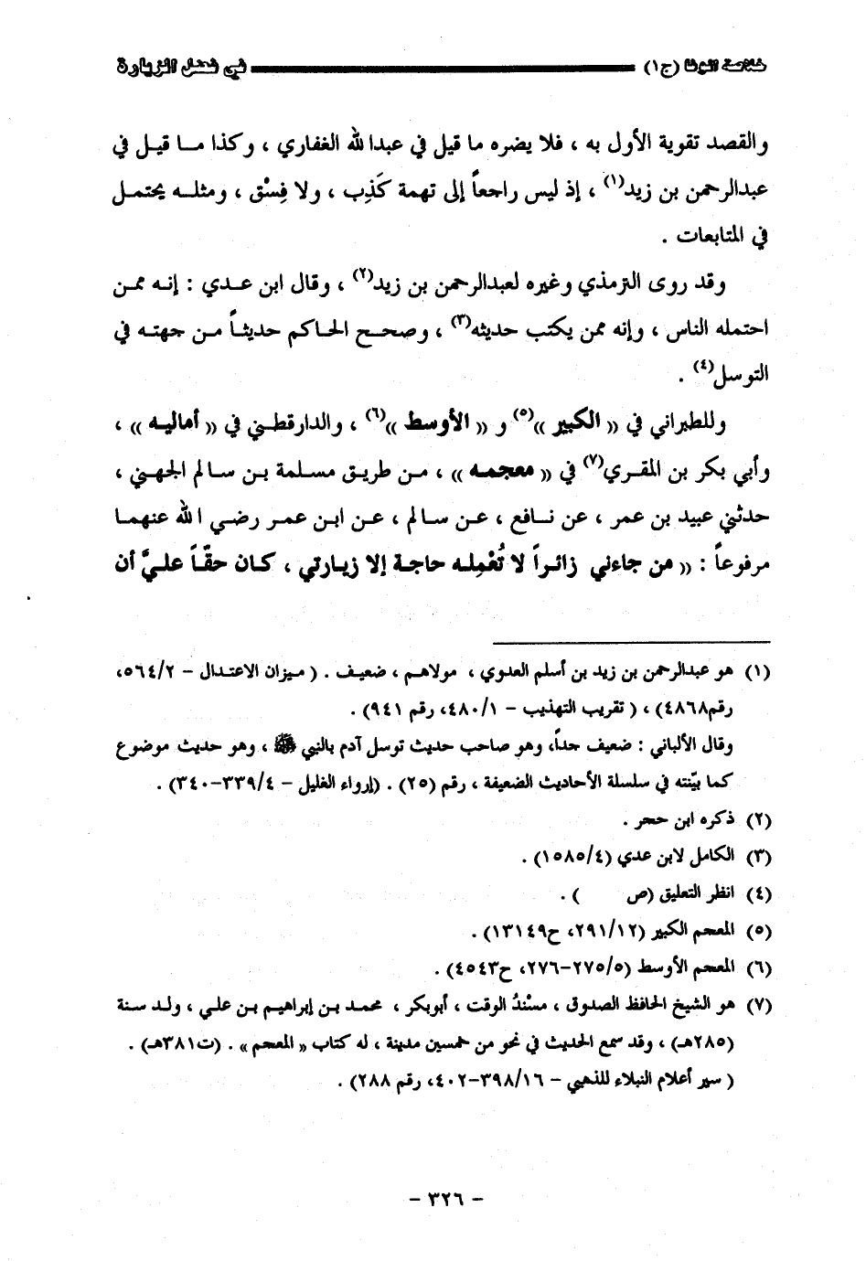 والقصد تقوية الأوّل به فلا يضره ما قيل في عبد الله الغفاري وكذا ما قيل في عبد الرحمن بن زيد إذ ليس راجعا إلى تهمة كذب ولا فسق ومقله يحتمل في المتابعات وقد روى الترمذي وغيره لعيد الرحمن بن زيد وقال أبن عدي إنه ممن احتمله الناس وإنه ممن يكتب حديثه وصحح الحاكم حديثا من جهته في التوسل وللطبرانيّ في الكبير والأوسط والدارقطني في أماليه وأبي بكر بن المقري في معجمه من طريق مسلمة بن سالم الجهني حدثني عبيد الله بن عمر عن نافع عن سالم عن أبن عمر رضي الله عنه مرفوعا من جاءني زائرا لا نعمده حاجة إلا زيارتي كان حقا عليّ أن