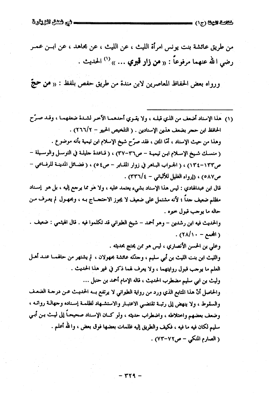 من طريق عائشة بنت يونس امرأة لليث عن الليث عن مجاهد عن أبن عمر رضي الله عنه مرفوعا من زار قبري الحديث ورواه بعض الحفاظ المعاصرين لأبن منده من طريق حفص بلفظ من حج