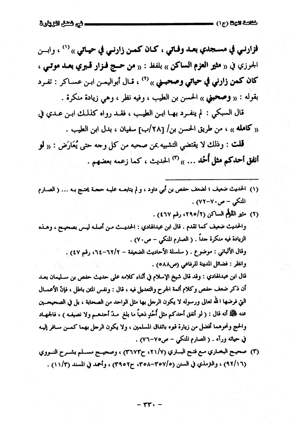 فزارني في مسجدي بعد وفاتي كان كمن زارني في حياتي وأبن الجوزي في مثير العزم الساكن بلفظ من حج فزار قبري بعد موتي كان كمن زارني في حياتي وصحبني قال أبو اليمن بن عساكر تفرد بقوله وصحبني الحسن بن الطيب وفيه نظر وهي زياده منكرة قال السبكيّ لم ينفرد بها أبن الطيب فقد رواه كذلك أبن عديّ في كامله من طريق الحسن بن سفيان بدل أبن الطيب قلت وذلك لا يقتضي التشبيه بمن صحبه من كل وجه حتى يعارض لو أنفق أحدكم مثل أحد الحديث كما زعمه