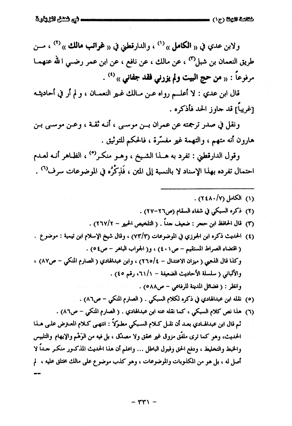 حجج البيت ولم يزرني فقد جفاني قال ابن عدي لا أعلم من رواه عن مالك غير النعمان ولم أر في أحاديثه حديثا غريبا قد جاوزا الحدّ فإذا كره ونقل في صدر ترجمته عن عمران أن بن موسى أنه ثقة وعن موسى بن هارون أنه مهتم والنهمة غير مفسرة فالحكم للتوثيق وقول الدارقطني تفرد به هذا الشيخ وهو منكر الظاهر أنه لعدم احتمال تفرد بهذا الإسناد لا بالنسبة إلى المتن فذكره في الموضوعات سرف