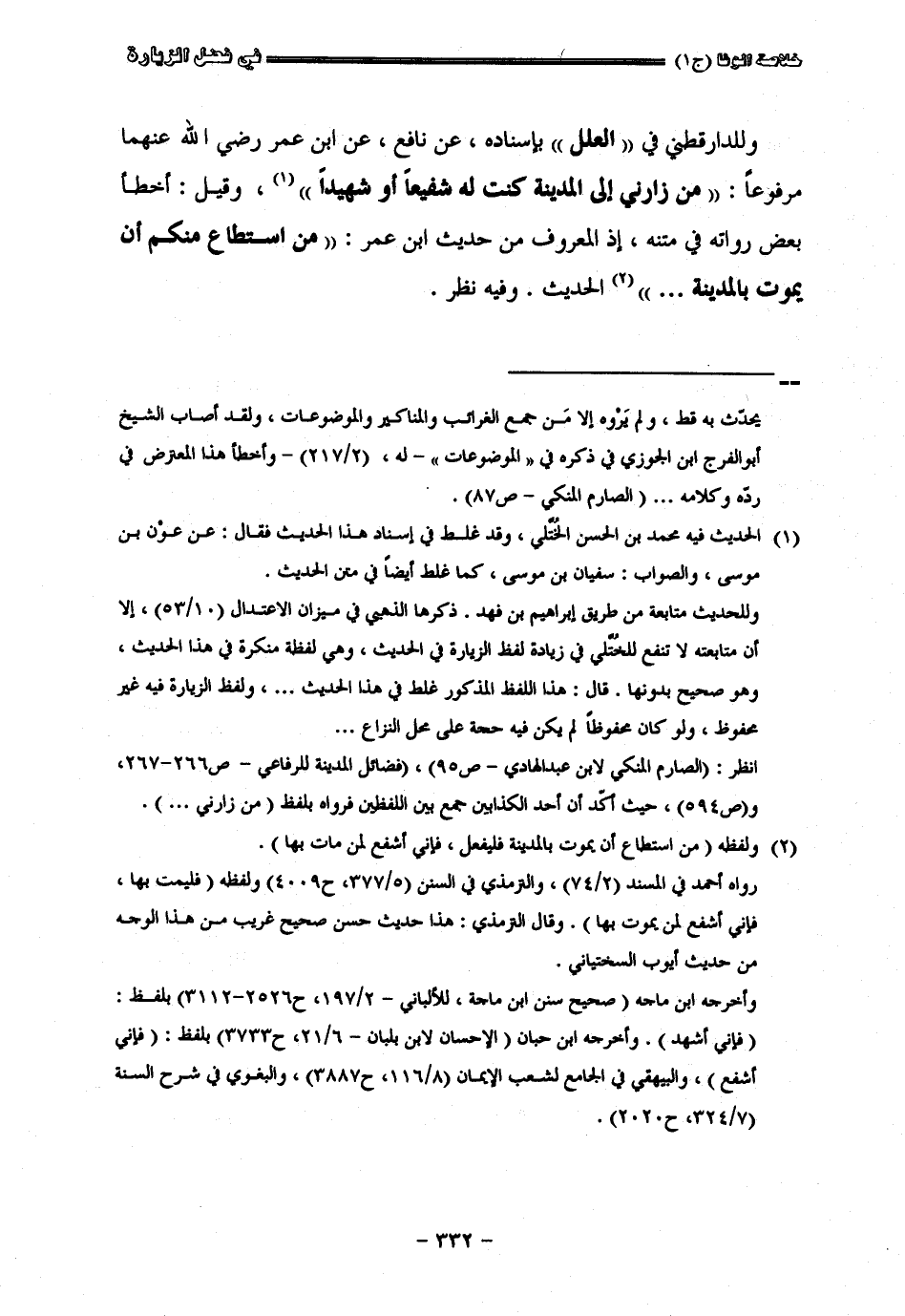 وللدارقطني في العلل عن نافع بن عمر رضي الله عنه مرفوعا زارني إلى المدينة كنت له شفيعا أو شهيدا وقيل أخطأ بعض رواته إذ المعروف من حديث ابن عمر من استطاع منكم أن يموت بالمدينة وفيه نظر