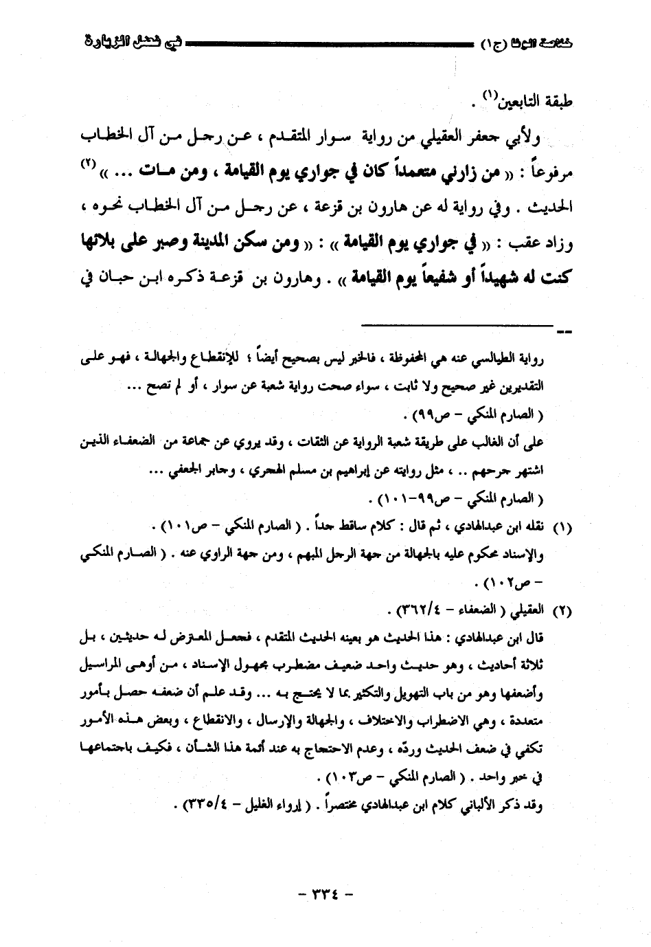 طبقة التابعين ولأبي جعفر العقيلي من رواية سوار المتقدم عن رجل من آل الخطاب مرفوعا من زارني متعمدا كان في جواري يوم القيامة ومن مات الحديث وفي رواية له عن هارون بن فزعة عن رجل من آل الخطاب نحوه وزاد عقب في جواري يوم القيامة ومن سكن المدينة وصبر على بلائها كنت له شهيدا وشفيعا يوم القيامة وهارون بن قزعة ذكره ابن حبان في