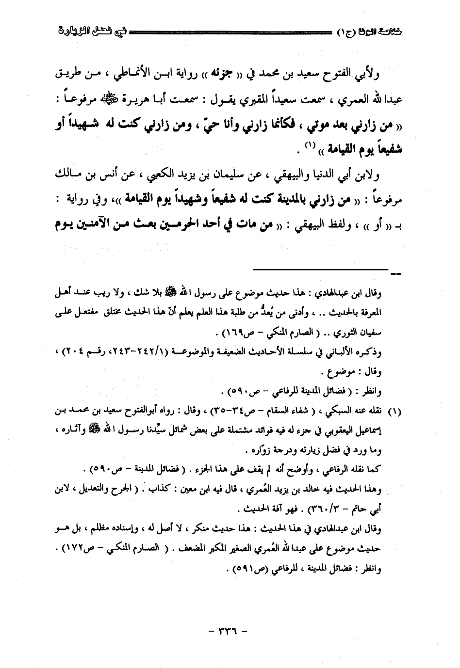 ولأبي الفتوح سعيد بن محمد في جزئه رواية ابن الأغاطي من طريق عبد الله العمري سمعت سعيد المقبري سمعت أبا هريرة رضي الله عنه مرفوعا من زارني بعد موتي فكأنما زارني وأنا حي كنت له شهيدا وشفيعا يوم القيامة ولبن أبي الدنيا والبهيقي عن سليمان بن يزيد الكعبي عن أنس بن مالك مرفوعا من زارني بالمدينة كنت له شفيعا وشهيدا يوم القيامة وفي رواية بأول ولفظ البهيقي من مات في أحد الحرمين بعث من الآمنين يوم