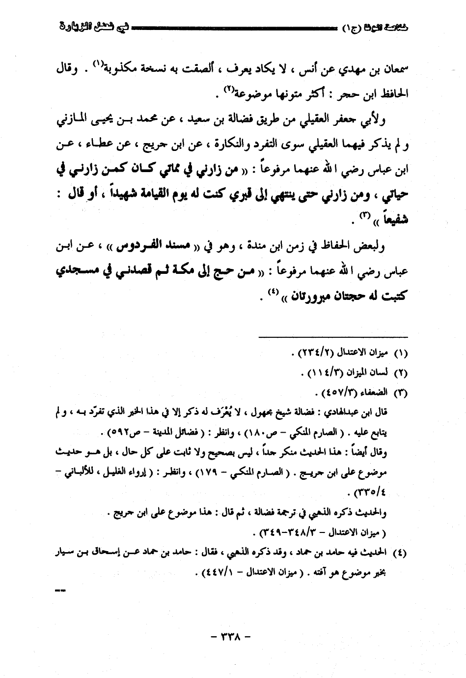 سمعان بن مهدي عن أنس لا يكاد يعرف الصمت به نسخة مكذوبة وقال الحافظ ابن حجرا أكثر متونها موضوعة ولأبي جعفر العقيلي من طريق فضالة بن سعيد عن محمد بن يحيي المازني ولم يذكر فيها العقيلي سوى التفرد والنكارة عن ابن جريج عن عطاء عن ابن عباس رضي الله عنه مرفوعا من زارني في مماتي كان كمن زارني في حياتي ومن زارني حتى ينتهي إلى قبري كنت له يوم القيامة شهيدا أو قال شفيعا ولبعض الحفاظ في زمن ابن مندة هو في مسند الفردوس عن ابن عباس رضي الله عنه مرفوعا من حج إلى مكة ثم قصدني في مسجدي كتبت له حجتان مبرورتان
