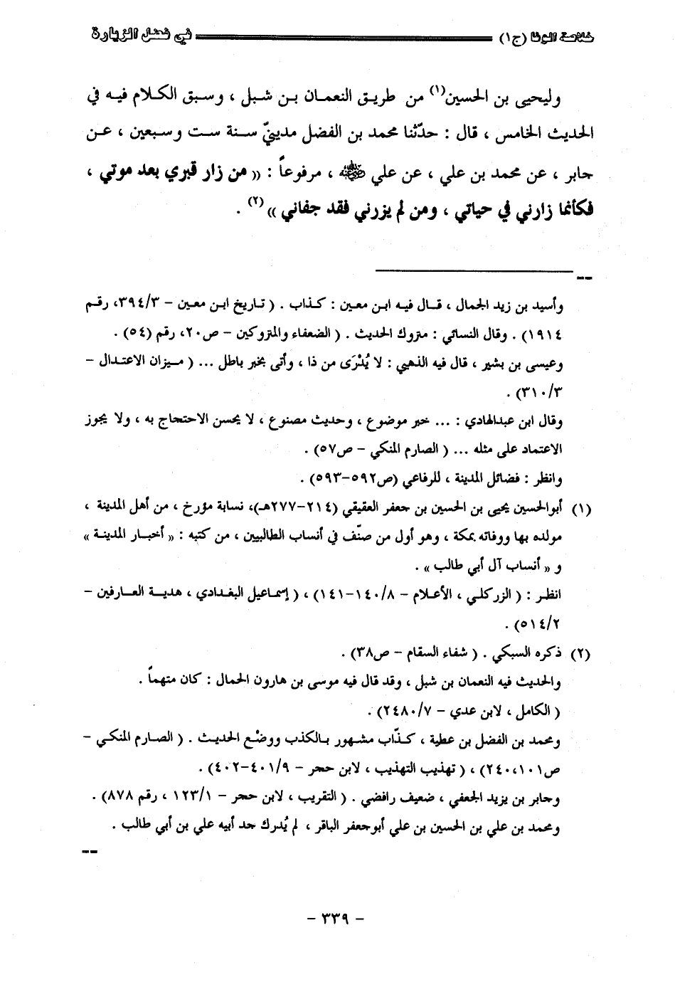 وليحيي بن الحسين من طريق النعمان بن شبل وسبق الكلام فيه في الحديث الخامس قال حدثنا محمد بن الفضل مديني سنة ست وسبعين عن جابر عن محمد بن علي رضي الله عنه مرفوعا من زار قبري بعد موتي فكأنما زارني في حياتي ومن لم يزرني فقد جفاني