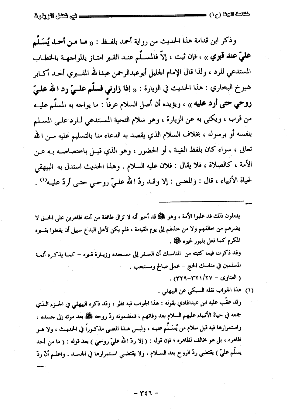 وذكر ابن قدامة هذا الحديث من رواية أحمد بلفظ ما من أحد يسلم علي عند قبري فإن ثبت وإلا فالمسلم عند القبر أمتاز بالمواجهة بالخطاب المستدعي للردّ ولذا قال الإمام الجليل أبو عبد الرحمن عبد الله المقبري أحد أكابر شيوخ البخاري هذا الحديث في الزيارة إذا زارني فسلم عليّ ردّ الله علي روحي حتى أردّ عليه