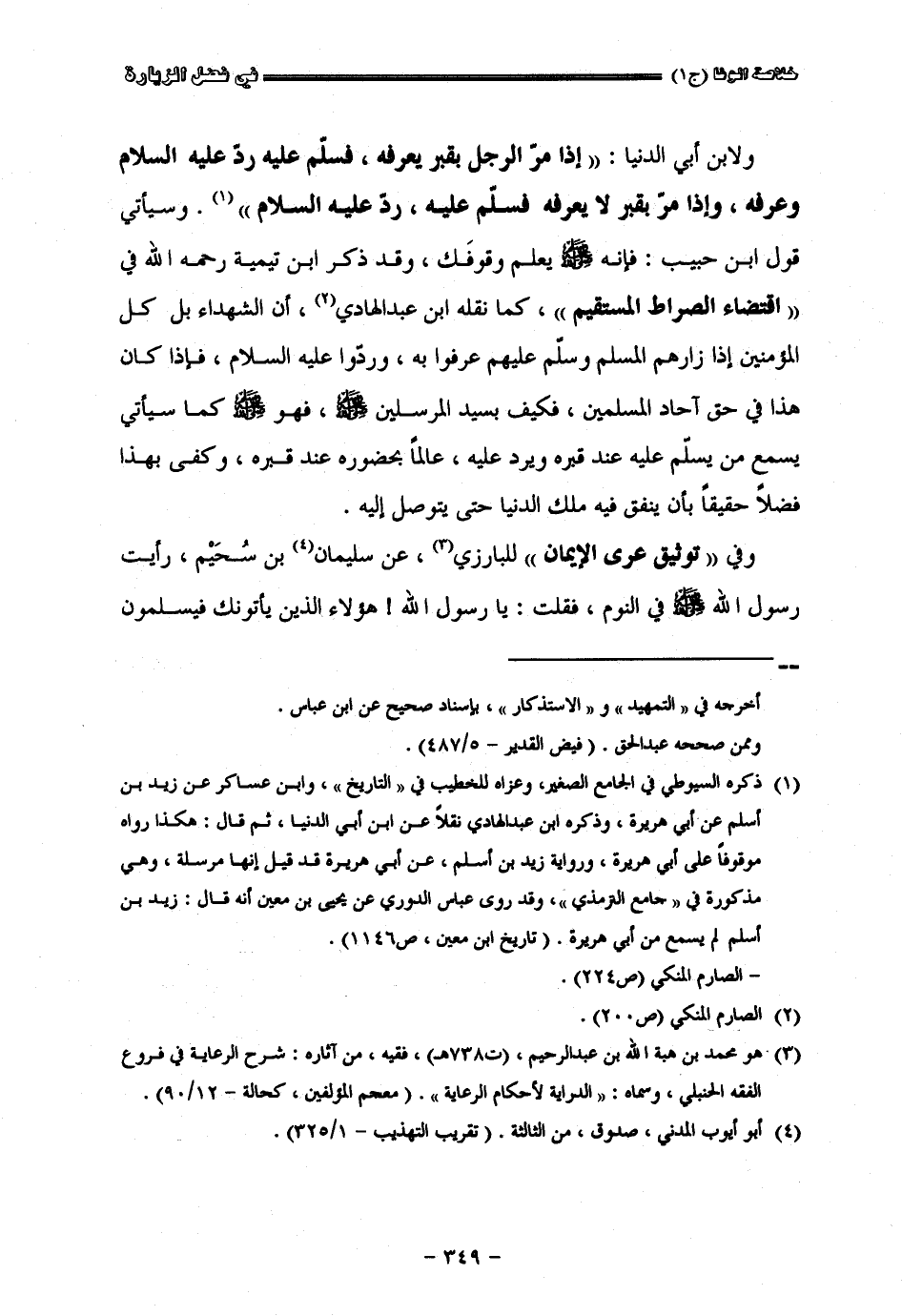 ولبن أبي الدنيا إذا مر الرجل بقبر يعرفه فسلم عليه ردّ عليه السلام وعرفه وإذا مر بقبر لا يعرفه فسلم عليه ردّ عليه السلام وسيأتي قول ابن حبيب فإنه صلى الله عليه وسلم يعلم وقوفك وقد ذكر ابن تيمية في اقتضاء الصراط المستقيم كما نقله ابن عبد الهادي أنّ الشهداء بل كل المؤمنين إذا زارهم المسلم وسلم عليهم عرفوا به وردّ عليه السلام فإذا كان هذا في حق آحاد المسلمين فكيف زارهم المسلم وسلم عليهم عرفوا به وردّ عليه السلام فإذا كان هذا في حق آحاد المسلمين فكيف بسيد المرسلين صلى الله عليه وسلم فهو صلى الله عليه وسلم كما سيأتي يسمع من يسلم عليه عند قبره ويردّ عليه عالما بحضوره عند قبره بهذا فضلا حقيقا بأن ينفق فيه ملك الدنيا حتى يتوصل إليه في توثيق عرى الإيمان للبارزي عن سليمان بن سحيم رأيت رسول الله صلى الله عليه وسلم في النوم فقلت يا رسول الله هؤلاء الذين يأتونك فيسلمون