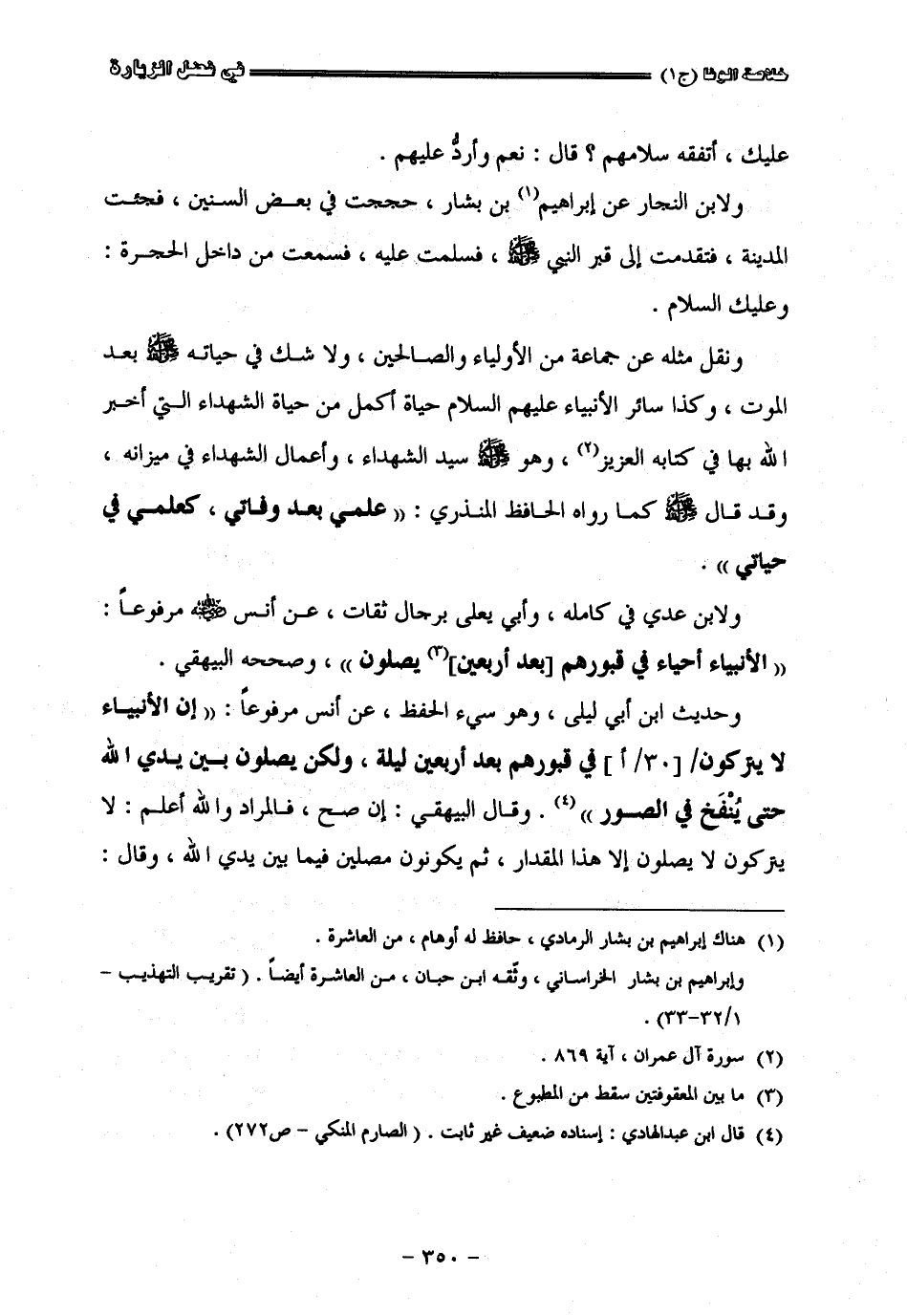 ولأبن النجار عن إبراهيم بن بشار حججت في بعض السنين فجئت المدينة فتقدمت إلى قبر النبي صلى الله عليه وسلم فسلمت عليه فسمعت من داخل الحجرة وعليك السلام ونقل مثله عن جماعة من الأولياء والصالحين ولا شك في حياته صلى الله عليه وسلم بعد الموت وكذا سائر الأنبياء عليهم السلام حياة أكمل من حياة الشهداء التي أخبر الله بها في كتابه العزيز وهو صلى الله عليه وسلم سيد الشهداء وأعمال الشهداء في ميزانه وقد قال صلى الله عليه وسلم كما رواه الحافظ المنذري علي بعد وفاتي كعلي في حياتي ولأبن عدي فى كامله وأبي بعلي برجال ثقات عن أنس رضي الله عنه مرفوعا الأنبياء أحياء في قبورهم يصلون وصححه البيهقي وحديث ابن أبي ليلى وهو سيئ الحفظ عن أنس مرفوعا أن الأنبياء لا يتركون في قبورهم بعد أربعين ليلة ولكن يصلون بين يدي الله حتى ينفخ في الصور وقال البيهقي أن صح فالمراد والله أعلم لا يتركون لا يصلون إلا هذا المقدار ثم يكونون مصلين فيما بين يدي الله وقال