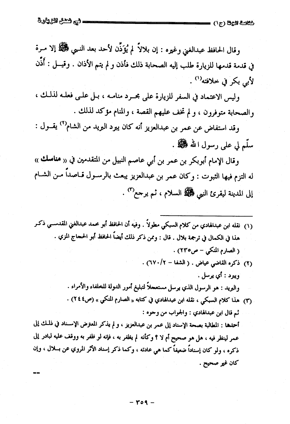 وسلم إلا مرة في قدمه للزيارة طلب غليه الصحابة ذلك فأذن ولم يتم الأذان وقيل أذن لأبي بكر في خلافته وليس الاعتماد في السفر للزيارة على مجرّد منامه بل على فعله لذلك والصحابة متوفون ولم تخف عليهم القصة والمنام مؤكد لذلك وقد استفاض عمر بن عبد العزيز أنه كان يبرد البريد من الشام يقول سلم على رسول الله صلى الله عليه وسلم وقال الإمام أبو بكر بن عمر بن أبي عاصم النبيل من المتقدمين في مناسك له التزم فيها الثبوت وكان عمر بن عبد العزيز يبعث بالرسول قاصدا من الشام إلى المدينة ليقرئ النبيّ صلى الله عليه وسلم السلام ثم يرجع