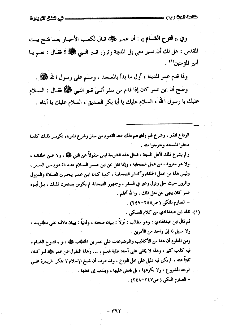 في فتوح الشام أن عمر رضي الله عنه قال لكعب الأحبار بعد فتح بيت المقدس هل لك أن تسير معي إلى المدينة وتزور قبر النبي صلى الله عليه وسلم فقال نعم يا أمير المؤمنين. ولما قدم عمر المدينة أول ما بدأ بالمسجد وسلم على رسول الله صلى الله عليه وسلم وصح أن عمر كان إذا قدم من سفر أتى قبر النبي صلى الله عليه وسلم فقال السلام عليك يا رسول الله السلام عليك يا أبا بكر الصديق السلام عليك يا أبتاه