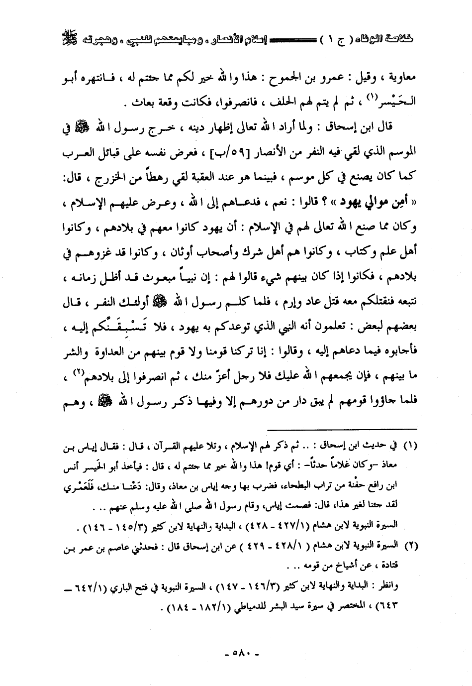 معاذ وقيل عمر بن الجموح هذا والله خير لكم مما جئتم له فأنتهره أبو الجيسر ثم لم يتم لهم الحلف فانصرفوا فكانت وقعة بعاث. قال ابن إسحاق ولما أراد الله تعالى إظهار دينه خرج رسول الله صلى الله عليه وسلم في الموسم الذي فيه النفر من الأنصار فعرض نفسه على قبائل العرب كما كان يصنع في كلّ موسم فبينما هو عند العقبة لقي رهطا من الخزرج قال أمن موالي يهود قالوا نعم فدعاهم إلى الله وعرض عليهم الإسلام وكان مما صنع الله تعالى لهم في الإسلام أن يهود كانوا معهم في بلادهم وكانوا أهل علم وكتاب وكانوا هم أهل شرك أصحاب أوثان وكانوا قد غزوهم في بلادهم فكانوا إذا كان بينهم شيء قالوا الهم أن نبيا مبعوث قد أظل زمانه نتبعه ونقتلكم معه قتل عاد وارم فلما كلم رسول الله صلى الله عليه وسلم أولئك النفر قال بعضهم لبعض تعلمون أنه النبي الذي توعدكم به يهو فلا تسبقنكم إليه فأجابوه فيما دعاهم إليه قالوا أنا تر كنا قومنا ولا قوم بينهم من العداوة والشر ما بينهم فإن يجمعهم الله عليك فلا رجل أعز منك ثم انصرفوا إلى بلادهم فلما جاءوا قومهم لم يبق دار من دورهم إلا وفيها ذكر رسول الله صلى الله عليه وسلم وهم