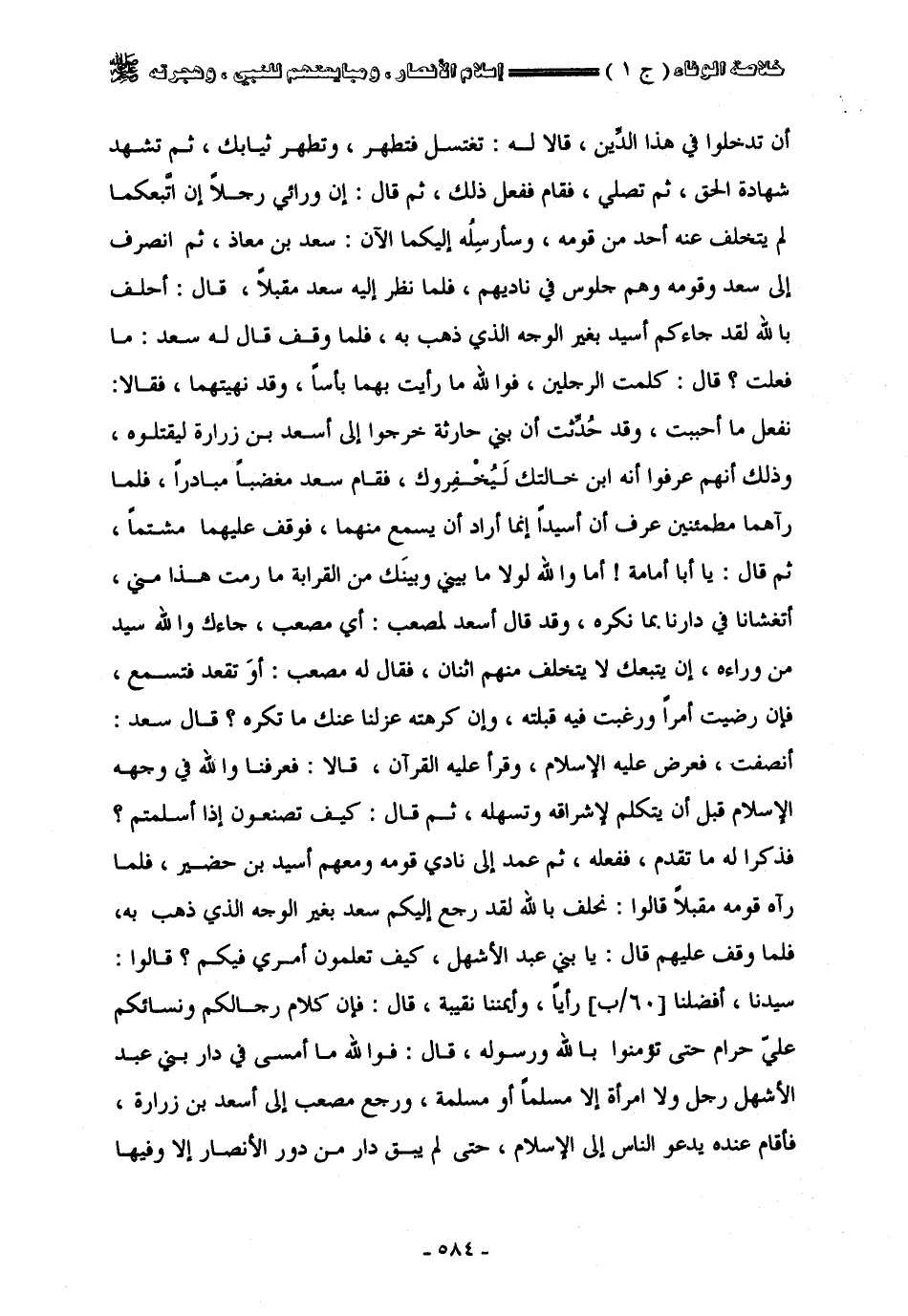 وهم جلوس في ناديهم فلما نظر إليهم سعد مقبلا قال أحلف بالله لقد جاءكم أسيد بغير الوجه الذي ذهب به فلما وقف قال له سعد ما فعلت قال كلمت الرجلين فوالله ما رأيت بهما بأسا وقد نهيتهما فقالا نفعل ما أحببت وقد حدّثت أنّ بني حارثة خرجوا إلى أسعد بن زرارة ليقتلوه وذلك أنهم عرفوا أنه ابن خالتك ليحقروك فقام سعد مغضبا مبادرا فلما رآهما مطمئنين عرف أن أسيدا إنما أراد أن يسمع منهما فوقف عليهما متسمتا ثم قال يا أبا أمامة أما والله لولا ما بيني وبينك من القرابة ما رمت هذا مني أتغشانا في دارنا بما تكره وقد قال أسعد أصعب أي مصعب جاءك والله سيد من وراءه إن يتبعك لا يتخلف منهم اثنان فقال له مصعب أو تقعد فتسمع فأن رضيت أمر أو رغبت فيه قبلته وأن كرهته عزلنا عنك ما تكره قال سعد أنصفت فعرض عليه الإسلام وقرأ عليه القرآن قالا فعرفنا والله في وجهه الإسلام قبل أن يتكلم لإشراقه وتسهله ثم قال كيف تصنعون إذا أسلمتم فذكرا له ما تقدّم ففعله ثم عمد إلى نادى قومه ومعهم أسيد بن حضير فلما رآه قومه مقبلا قالوا نحلف بالله لقد رجع إليكم سعد بغير الوجه الذي ذهب به فلما وقف عليهم قال يا بني عبد الأشهل كيف تعلمون أمري فيكم قالوا سيدنا أفضلنا رأيا وأيمننا نقيبه قال فإن كلام رجالكم ونسائكم عليّ حرام حتى تؤمنوا بالله ورسوله قال فوالله ما أمسى في دار بني الأشهل رجل ولا امرأة إلا مسلما أو مسلمة ورجع مصعب إلى أسعد بن زرارة فأقام عنده يدعو الناس إلى الإسلام حتى لم يبق دار من دور الأنصار إلا وفيها