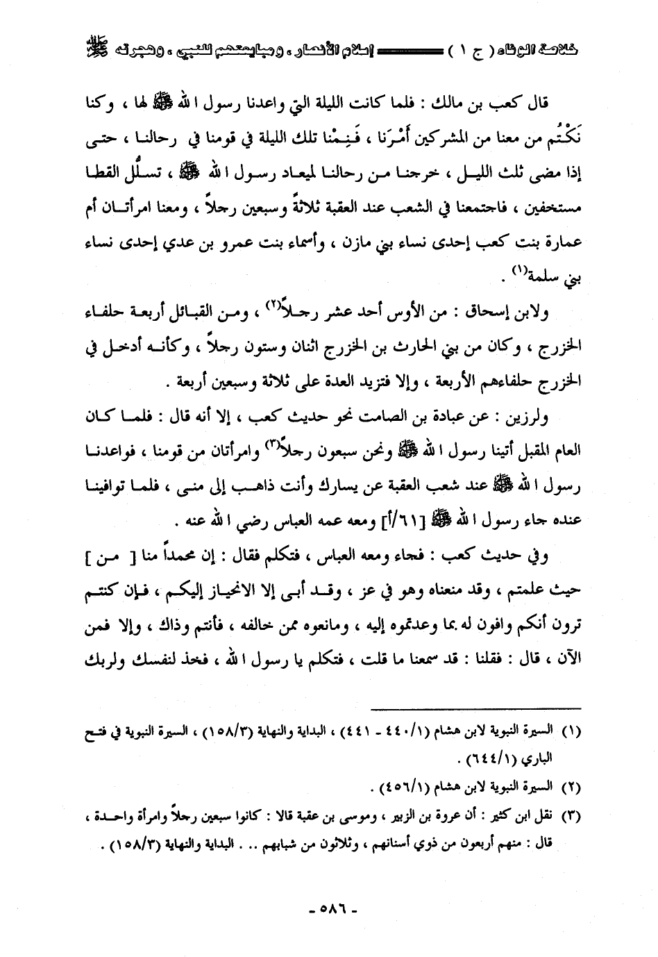 قال كعب بن مالك فلما كانت الليلة التي واعدنا رسول اله صلى الله عليه وسلم لها وكنا نكتم من معنا من المشركين أمرنا فنمنا تلك الليلة في قومنا وفي رحالنا حتى إذا مضى ثلث الليل خرجنا من رحالنا لميعاد رسول الله صلى الله عليه وسلم تسلل القطا مستخفين فاجتمعنا في الشعب عند العقبة ثلاثة وسبعين رجلا ومعنا امرأتان أم عمارة بنت كعب إحدى نساء بني مازن وأسماء بنت عمرو بن عدي إحدى نساء بني سلمة ولأبن إسحاق من الأوس أحد عشر رجلا ومن القبائل أربعة حلفاء الخزرج وكان من بني الحرث بن الخزرج اثنان وستون رجلا وكأنه أدخل في الخزرج حلفاءهم الأربعة وإلا فتزيد العدّة على ثلاثة وسبعين أربعة ولرزين عن عبادة بن الصامت نحو حديث كعب إلا أنه قال فلما كان العام المقبل أتينا رسول الله صلى الله عليه وسلم ونحن سبعون رجلا وامرأتان من قومنا فواعدنا رسول الله صلى الله عليه وسلم عند شعب العقبة عن يسارك وأنت ذاهب إلى منى فلما توافينا عنده جاء رسول الله صلى الله عليه وسلم ومعه عمه العباس رضي الله عنه وفي حديث كعب فجاء ومعه العباس فتكلم فقال أن محمدا منا من حيث علمتم وقد منعناه وهو في عز وقد أبى إلا الانحياز إليكم فإن كنتم ترون أنكم وافون له بما وعدتموه إليه ومانعوه ممن خالفه فانتم وذاك وإلا فمن الآن قال فقلنا قد سمعنا ما قلت فتكلم يا رسول الله فخذ لنفسك ولربك
