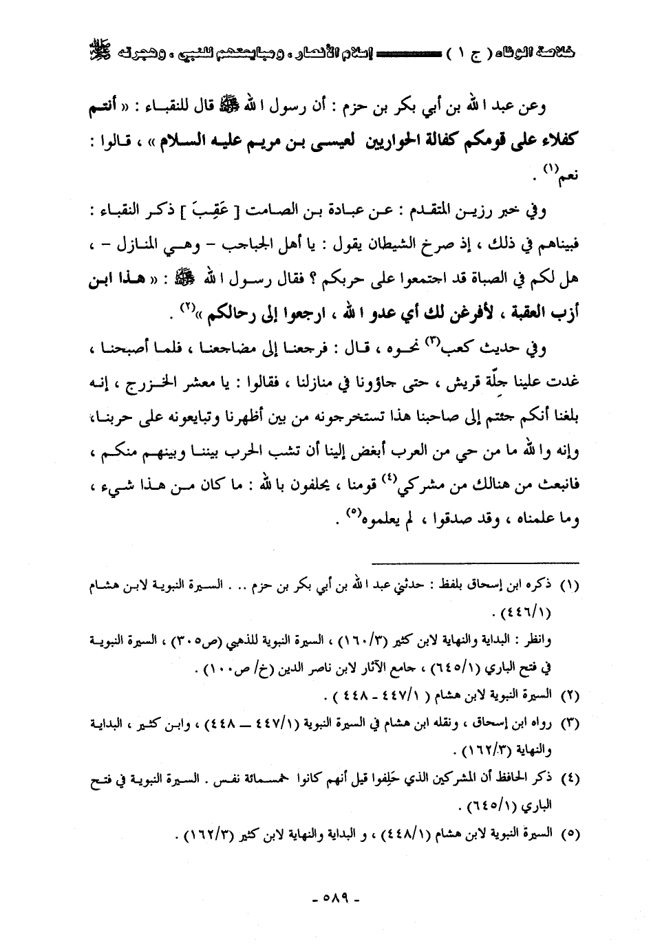 وعن عبد الله بن أبي بكر حزم أن رسول الله صلى الله عليه وسلم قال للنقباء أنتم كفلاء على قومكم كفالة الحواريين لعيسى بن مريم عليه السلام قالوا نعم وفي خبر رزين المتقدم عن عبادة بن الصامت عقب ذكر النقباء فبينا هم في ذلك إذ صرخ الشيطان يقول يا أهل الجباجب وهي المنازل هل لكم في الصباة قد أجمعوا على حربكم فقال رسول الله صلى الله عليه وسلم هذا ابن أرب العقبة لأفرغنّ لك أي عدوّ الله أرجعوا إلى رحالكم فقال له العباس بن عبادة بن نضلة والذي بعثك بالحق نبيا لئن شئت لنميلن بأسيافنا غدا على منى فقال له لم أؤمر بذلك ولكن أرجعوا إلى رجالكم وفي حديث كعب نحوه قال فرجعنا إلى مضاجعنا فلما أصبحنا غدت علينا رجلة قريش حتى جاءونا في منازلنا فقالوا يا معشر الخزرج أنه بلغنا أنكم جئتم إلى صاحبنا هذا تستخرجونه من بين أظهرنا وتبايعونه على حربنا وأنه والله ما من حيّ من العرب أبغض إلينا أن تشب الحرب بيننا وبينهم منكم فانبعث من هنالك من مشركي قومنا يحلفون بالله ما كان من هذا شيء وما علمناه وقد صدقوا لم يعلموه
