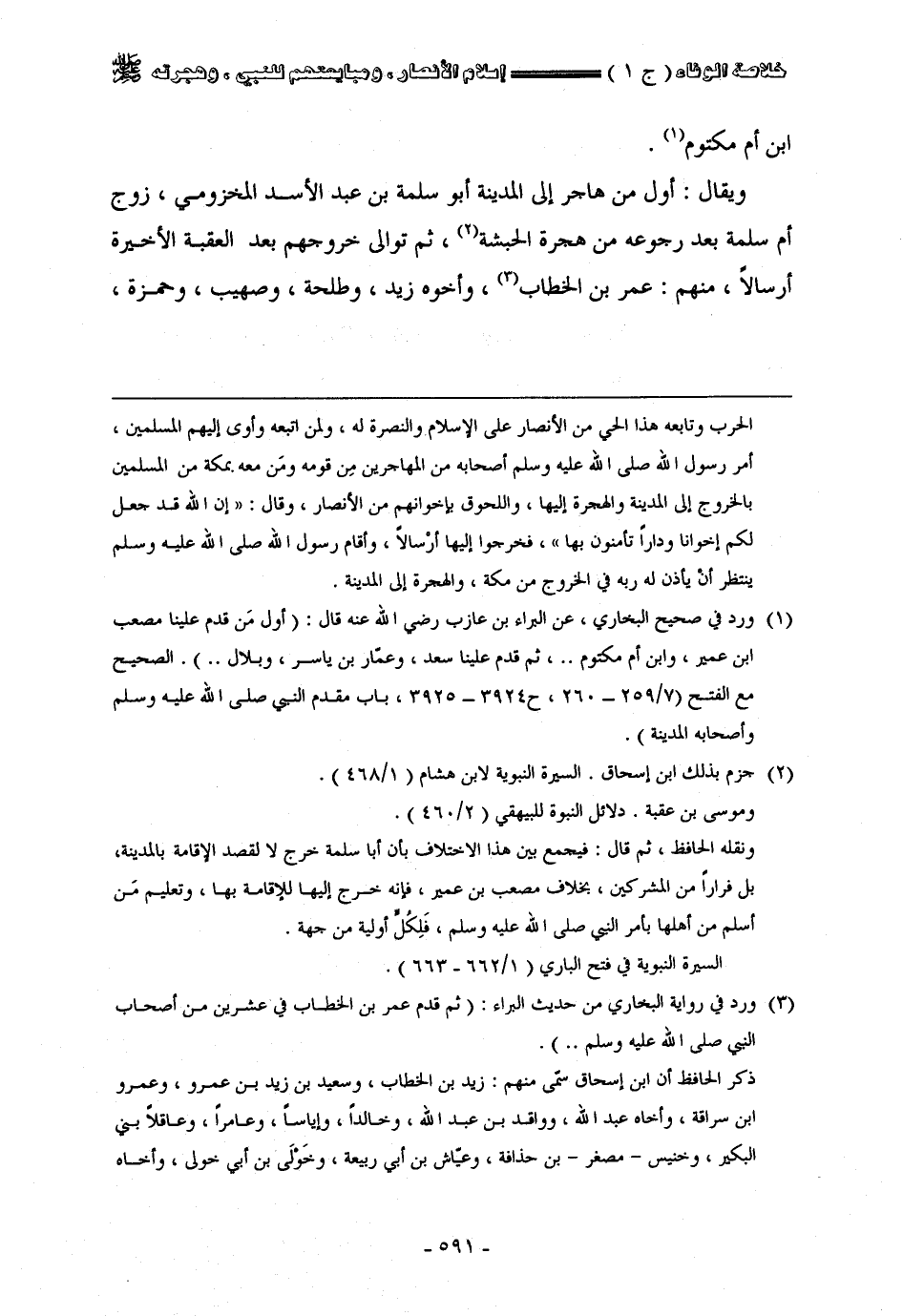 ابن أم مكتوم ويقال أوّل من هاجر إلى المدينة أبو سلمة بن عبد الأسد المخزومي زوج أم سلمة بعد رجوعه من هجرة الحبشة ثم توالى خروجهم بعد العقبة الأخيرة إرسالا منهم عمر بن الخطاب وأخوه زيد وطلحة وصهيب وحمزة