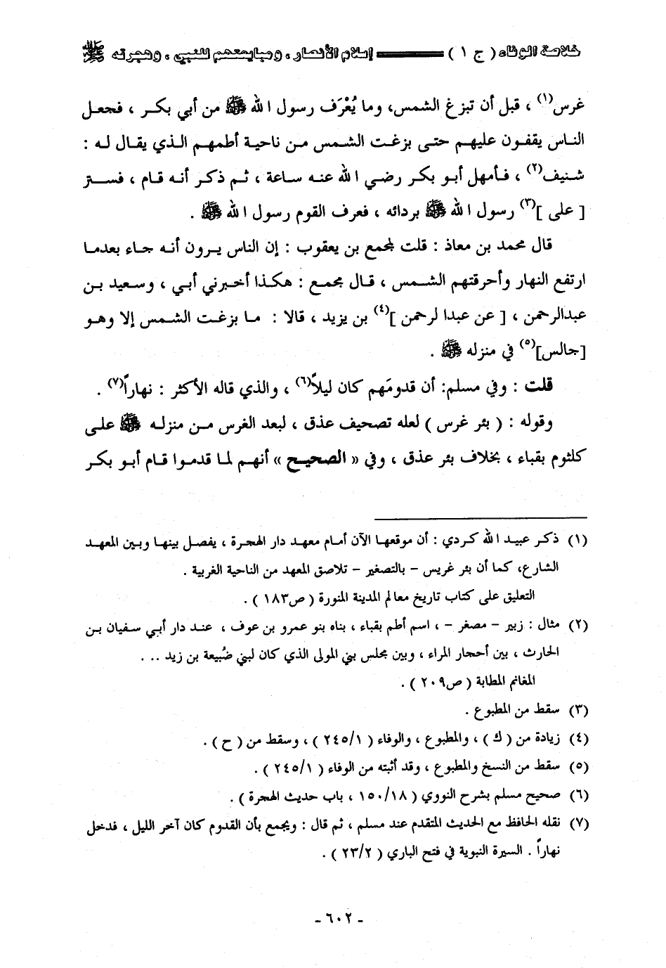 غرس قبل أن تبزغ الشمس وما يعرف رسول الله صلى الله عليه وسلم من أبي بكر فجعل الناس يقفون عليهم حتى بزغت الشمس من ناحية أطمهم الذي يقال له شقيف فأمهل أبو بكر رضي الله عنه ساعة ثم ذكر أنه قام فستر على رسول الله صلى الله عليه وسلم بردائه فعرف القوم رسول الله صلى الله عليه وسلم قال محمد بن معاذ قلت لمجمع ابن يعقوب أن الناس يرون أنه جاء بعدما أرتفع النهار وأحرقتهم الشمس قال مجمع هكذا أخبرني أبي وسعيد بن عبد الرحمن عن عبد الرحمن بن يزيد فالا ما بزغت الشمس إلا وهو في منزله صلى الله عليه وسلم قلت وفي مسلم أن قدومهم كان ليلا والذي قاله الأكثر نهارا وقوله بئر غرس لعله تصحيف عذق الغرس من منزله صلى الله عليه وسلم على كلثوم بقباء بخلاف بئر عذق وفي الصحيح أنهم لما قدموا أقام أبو بكر