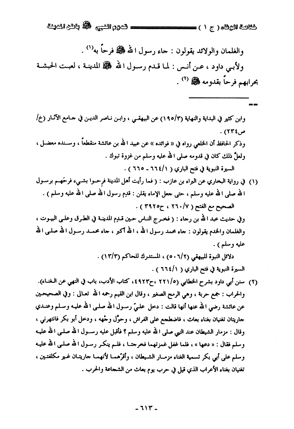 والغلمان والولائد يقولون جاء رسول الله صلى الله عليه وسلم فرحا به ولأبي داود عن أنس لما قدم رسول الله صلى الله عليه وسلم المدينة لعبت الحبشة بحرابهم فرحا بقدومه صلى الله عليه وسلم