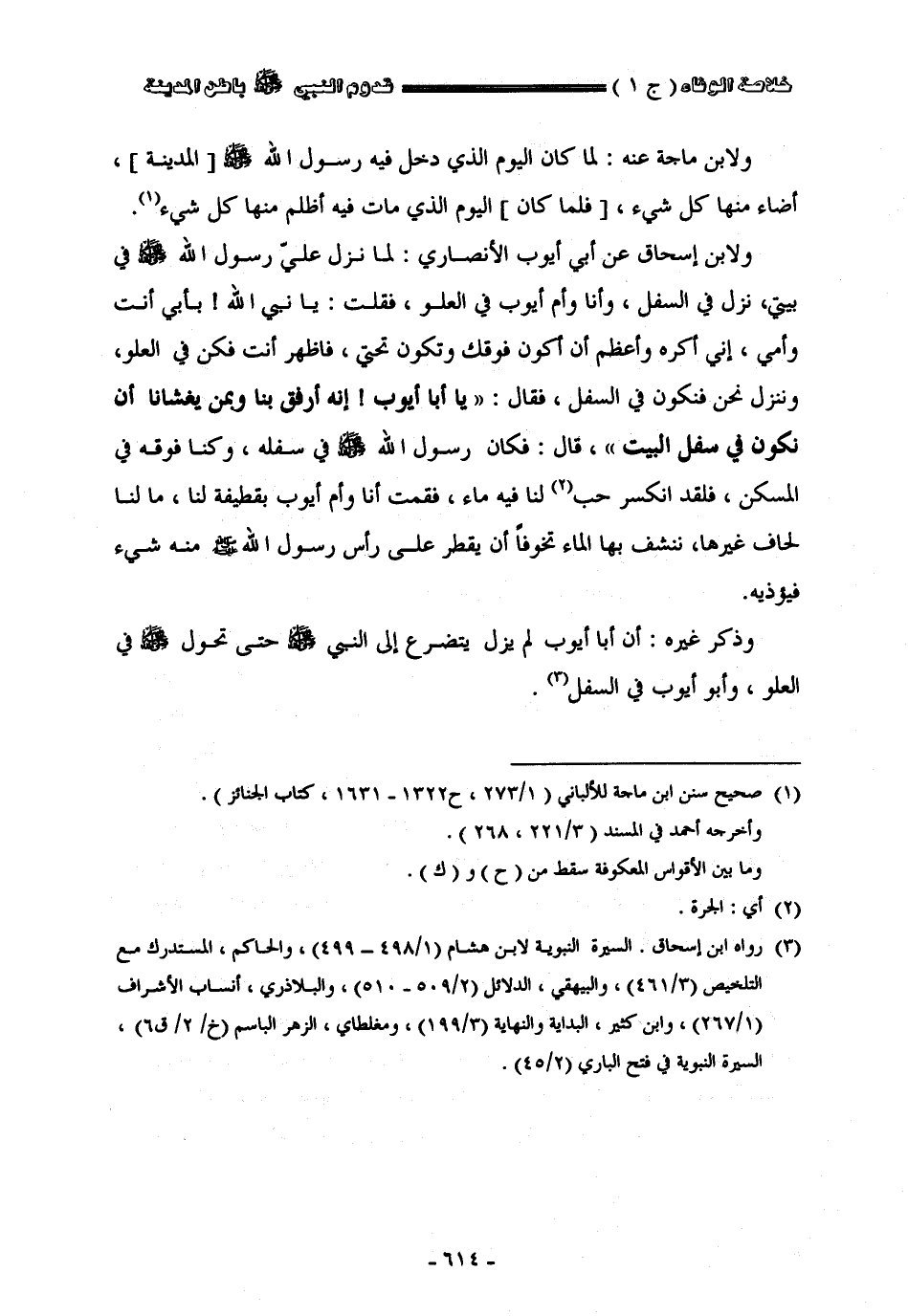 ولأبن ماجة عنه لما كان اليوم الذي دخل فيه رسول الله صلى الله عليه وسلم المدينة أضاء منها كل شيء فلما كان اليوم الذي مات فيه أظلم منها كل شيء. ولأبن إسحاق عن أبي أيوب الأنصاري لما نزل على رسول الله صلى الله عليه وسلم في بيتي نزل في السفل وأنا وأم أيوب في العلو فقلت يا نبيّ الله بأبي أنت وأمي أني أكره وأعظم أن أكون فوقك وتكون تحتي فأظهر أنت فكن في العلو وننزل نحن فنكون في السفل فقال يا أبا أيوب أنه أرفق بنا وبمن يغشانا أن نكون في سفل البيت قال فكان رسول الله صلى الله عليه وسلم في سفله وكنا فوقه في المسكن فلقد أنكسر حب لنا فيه ماء فقمت أنا وأم أيوب بقطيفة لنا ما لنا لحاف غيرها ننشف بها الماء تخوفا أن يقطر على رأس رسول الله صلى الله عليه وسلم منه شيء فيؤذيه وذكر غيره أن أبا أيوب لم يزل يتضرع إلى النبي صلى الله عليه وسلم حتى تحول صلى الله عليه وسلم في العلو وأبو أيوب في السفل