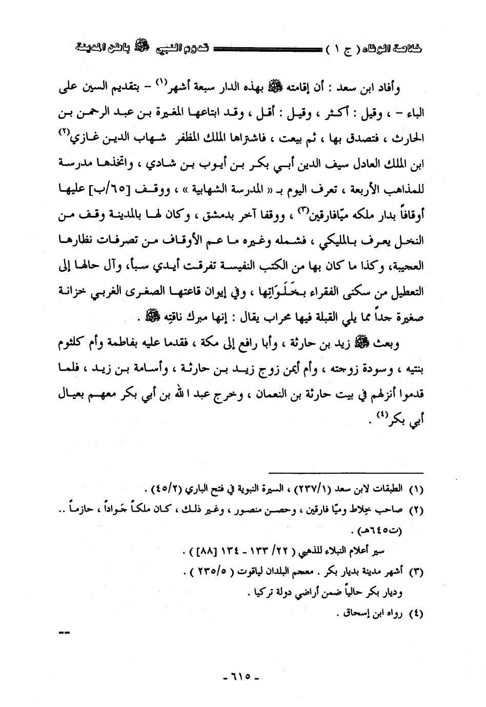 وأاد ابن سعد أن أقامته صلى الله عليه وسلم بهذه الدار سبعة أشهر بتقديم السين على الباء وقيل أكثر وقيل أقل وقد ابتاعها المغيرة بن عبد الرحمن بن الحرث فتصدّق بها ثم بيعت فاشتراها الملك المظفر شهاب الدين بن غازي ابن الملك العادل سيف الدين أبي بكر بن أيوب بن شادي وأتخذها مدرسة للمذاهب الأربعة تعرف اليوم بالمدرسة الشهابية ووقف عليها أوقافا بدار ملكه ميافارقين ووقفا آخر بدمشق وكان لها بالمدينة وقف من النخل يعرف بالمليكي فشمله وغيره ما عم الأوقاف من تصرفات نظارها العجيبة وكذا ما كان بها من الكتب النفسية تفرّقت أيدي سبا وآل حالها إلى التعطيل من سكتي الفقراء بخلواتها وفي إيوان قاعتها الصغرى الغربي خزانة صغيرة جدّا مما يلي القبلة فيها محراب يقال إنها مبرك ناقته صلى الله عليه وسلم وبعث صلى الله عليه وسلم زيد بن حارثة وآبا رافع إلى مكة فقدما عليه بفاطمة وأم كلثوم بتتيه وسودة زوجته وأم أيمن زوج زيد بن حارثة وأسامة بن زيد فلما قدموا أنزلهم في بيت حارثة بن النعمان وخرج عبد الله بن أبي بكر معهم بعيال أبي بكر