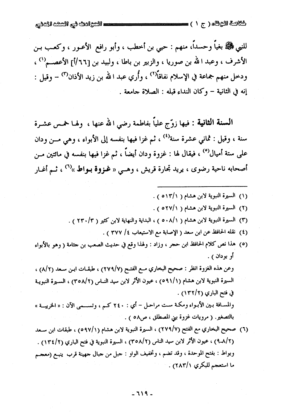 " السنة الثانية " فيها زوج عليا بفاطمة رضي الله عنه ولها خمس عشر سنة وقيل ثماني عشرة سنة ثم غزا بنفسه إلى الإيواء وهي من ودّان على ستة أميال فيقال لها غزوة ودّان أيضا ثم غزا فيها بنفسه في مائتين من أصحابه ناحية رضوي يريد تجار قريس وهي غزوة بواط ثم أغار