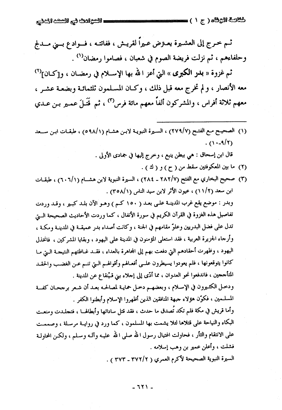 ثم خرج إلى العشيرة يعترض عيرا لقريش ففاتته فوادع بني مدلج وحلفاءهم ثم نزلت فريضة الصوم في شعبان فصاموا رمضان ثم غزوة بدر الثانية التي أعز الله بها الإسلام في رمضان وكان معه الأنصار ولم تخرج معه قبل ذلك وكان المسلمون ثلاثمائة وبضعة عشر معهم ثلاثة أفراس والمشركون ألفا معهم مائة فرس ثم قتل عمير أبن عدي