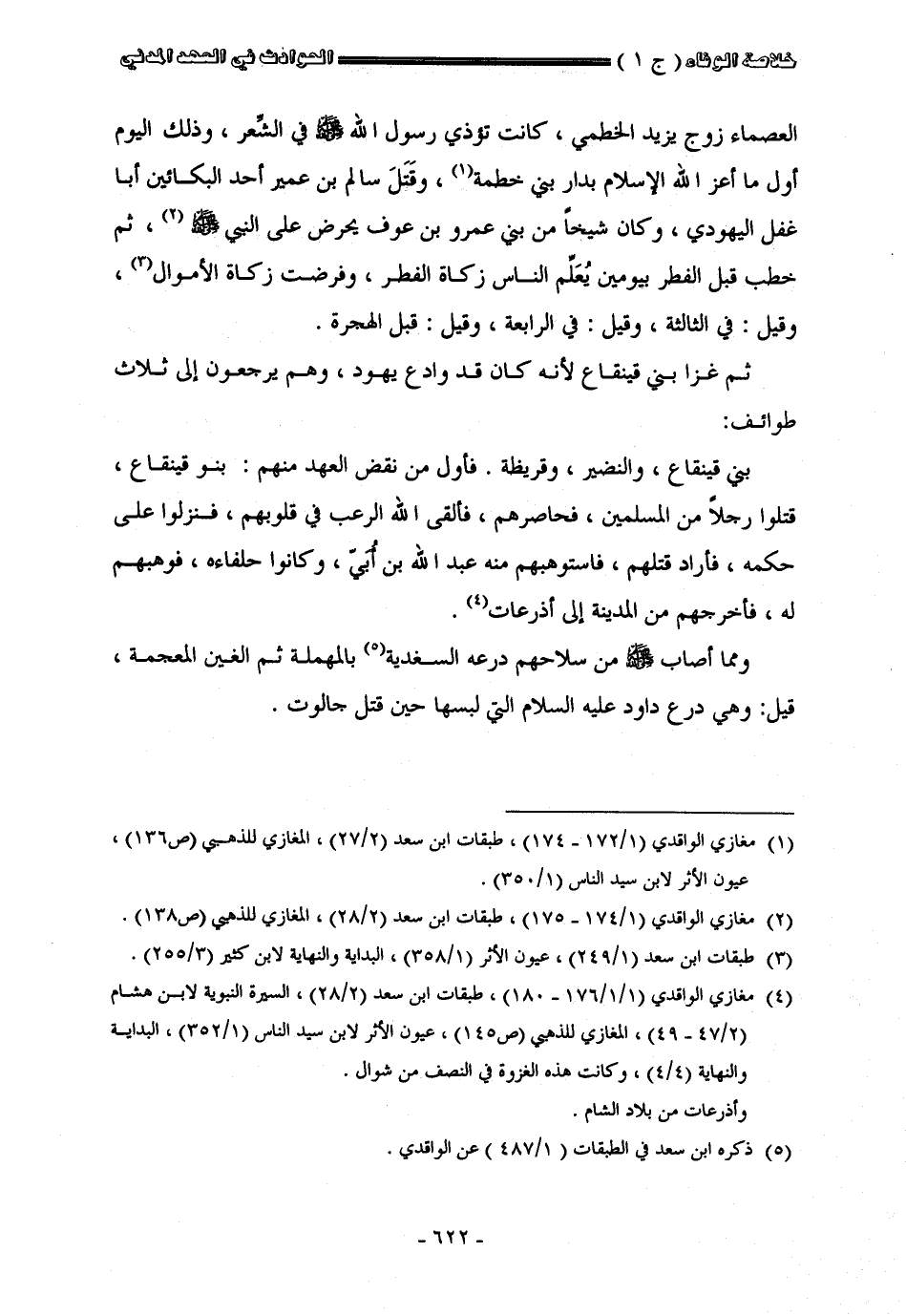 العصماء زوج يزيد الخطميّ كانت تؤذي رسول الله صلى الله عليه وسلم في الشعر وذلك اليوم أوّل ما أعز الله الإسلام بدار بني خطمة وقتل سالم بن عمير أحد البكائين أبا غفل اليهودي وكان شيخا من بني عمرو بن عوف يحرض على النبي صلى الله عليه وسلم ثم خطب قبل الفطر بيومين يعلم الناس زكاة الفطر وفرضت زكاة الأموال وقيل في الثالثة وقيل في الرابعة وقيل قبل الهجرة. ثم غزا بني قينقاع لأنه كان قد وادع يهود وهم يرجعون إلى ثلاث طوائف بني فينقاع والنضير وقريظة فأوّل من نقض العهد منهم بنو قينقاع وقتلوا رجلا من المسلمين فحاصرهم فألقى الله الرعب في قلوبهم فنزلوا على حكمه فأراد قتلهم فأستوهبهم منه عبد الله بن أبيّ وكانوا حلفاءه فوهبهم له فأخرجهم من المدينة إلى أذرعات ومما أصاب صلى الله عليه وسلم من سلاحهم درعه السغدية بالمهملة ثم الغين المعجمة قيل وهي درع داود عليه السلام التي لبسها حين قتل جالوت