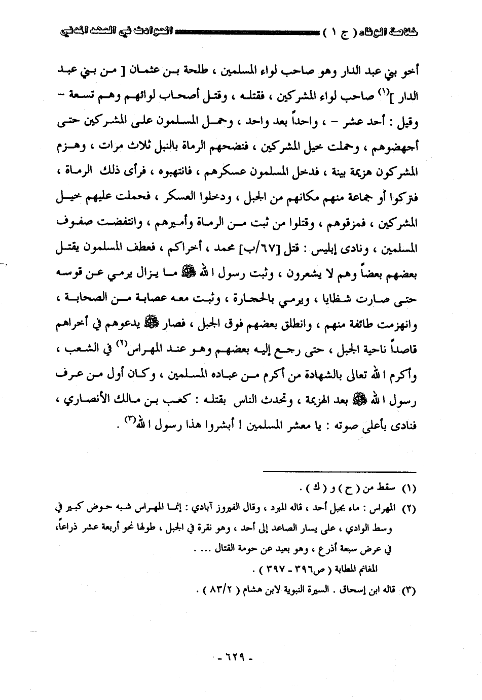 المشركون هزيمة بينة فدخل المسلمون عسكرهم فانتهبوه فرأى ذلك الرماة فتركوا أو جماعة منهم مكانهم من الجبل ودخلوا العسكر فحملت عليهم خيل المشركين فمزقوهم وقتلوا من ثبت من الرماة وأميرهم وانتقضت صفوف المسلمين ونادى إبليس قتل محمد أخراكم فعطف المسلمون بقتل بعضهم بعضا وهم لا يشعرون وثبت رسول الله صلى الله عليه وسلم ما يزال يرمي عن قوسه حتى صارت شظايا ويرمي بالحجارة وثبت معه عصابة من الصحابة وانهزمت طائفة منهم وانطلق بعضهم فوق الجبل فصار صلى الله عليه وسلم يدعوهم في أخراهم قاصدا ناحية الجبل حتى رجع إليه بعضهم وهو عند المهراس في الشعب وأكرم الله تعالى بالشهادة من أكرم من عبادة المسلمين وكان أوّل من عرف رسول الله صلى الله عليه وسلم بعد الهزيمة وتحدّث الناس بقتله كعب بن مالك الأنصاريّ فنادى بأعلى صوته يا معشر المسلمين أبشروا هذا رسول الله صلى الله عليه وسلم. ولما أسند رسول الله صلى الله عليه وسلم في الشعب أدركه أبيّ بن خلف فطعنه صلى الله عليه وسلم في عنقه طعنة تدأدأ منها عن فرسه مرارا فمات عدو الله بسرف وكسرت رباعيته صلى الله عليه وسلم وهشمت البيضة على رأسه وسال الدم على وجهه صلى الله عليه وسلم ولما انتهى إلى الشعب علت عالية من قريش الجبل فقال اللهمّ إنه لا ينبغي لهم أن يعلونا فقاتهلم عمر بن الخطاب رضي الله عنه في رهط من المهاجرين حتى أهبطوهم من الجبل ونهض رسول الله صلى الله عليه وسلم إلى صخرة من الجبل ليعلوها فلم يستطع وقد كان بدن وظاهر بين درعين فجلس تحته طلحة بن عبيد الله فنهض به حتى استوى عليها وصلى يومئذ الظهر قاعدا من الجراح والمسلمون خلفه قعودا ونادى أبو سفيان عند انصرافه موعدكم بدر العام القابل فقال صلى الله عليه وسلم لرجل من أصحابه قل نعم وهو بيننا وبينكم موعد ثم خرج بعد الوقعة مرهبا بعدوه حتى انتهى إلى حمراء الأسد فأخذ في وجهه ذلك أبا عزة الجمعيّ فضرب عنقه وتزوج حفصه بن عمر رضي الله عنها في شعبان على الأصح وزينب بنت خزيمة في رمضان فأتت بعد شهرين أو ثلاثة وولد الحسن بن عليّ في منتصف رمضان وعلقت أمه بالحسين وتزوج عثمان أم كلثوم رضي الله عنها وحرمت الخمر ويقال في التي بعدها ويقال بل سنة ثمان. المشركون هزيمة بينة فدخل المسلمون عسكرهم فانتهبوه فرأى ذلك الرماة فتركوا أو جماعة منهم مكانهم من الجبل ودخلوا العسكر فحملت عليهم خيل المشركين فمزقوهم وقتلوا من ثبت من الرماة وأميرهم وانتقضت صفوف المسلمين ونادى إبليس قتل محمد أخراكم فعطف المسلمون بقتل بعضهم بعضا وهم لا يشعرون وثبت رسول الله صلى الله عليه وسلم ما يزال يرمي عن قوسه حتى صارت شظايا ويرمي بالحجارة وثبت معه عصابة من الصحابة وانهزمت طائفة منهم وانطلق بعضهم فوق الجبل فصار صلى الله عليه وسلم يدعوهم في أخراهم قاصدا ناحية الجبل حتى رجع إليه بعضهم وهو عند المهراس في الشعب وأكرم الله تعالى بالشهادة من أكرم من عبادة المسلمين وكان أوّل من عرف رسول الله صلى الله عليه وسلم بعد الهزيمة وتحدّث الناس بقتله كعب بن مالك الأنصاريّ فنادى بأعلى صوته يا معشر المسلمين أبشروا هذا رسول الله صلى الله عليه وسلم.