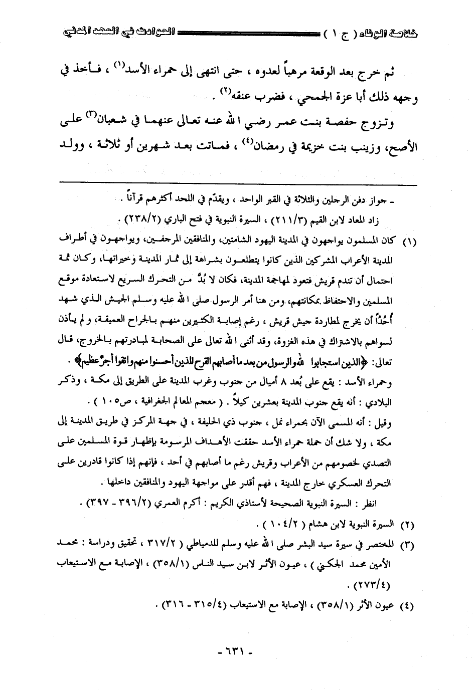 ثم خرج بعد الوقعة مرهبا بعدوه حتى انتهى إلى حمراء الأسد فأخذ في وجهه ذلك أبا عزة الجمعيّ فضرب عنقه وتزوج حفصه بن عمر رضي الله عنها في شعبان على الأصح وزينب بنت خزيمة في رمضان فأتت بعد شهرين أو ثلاثة وولد