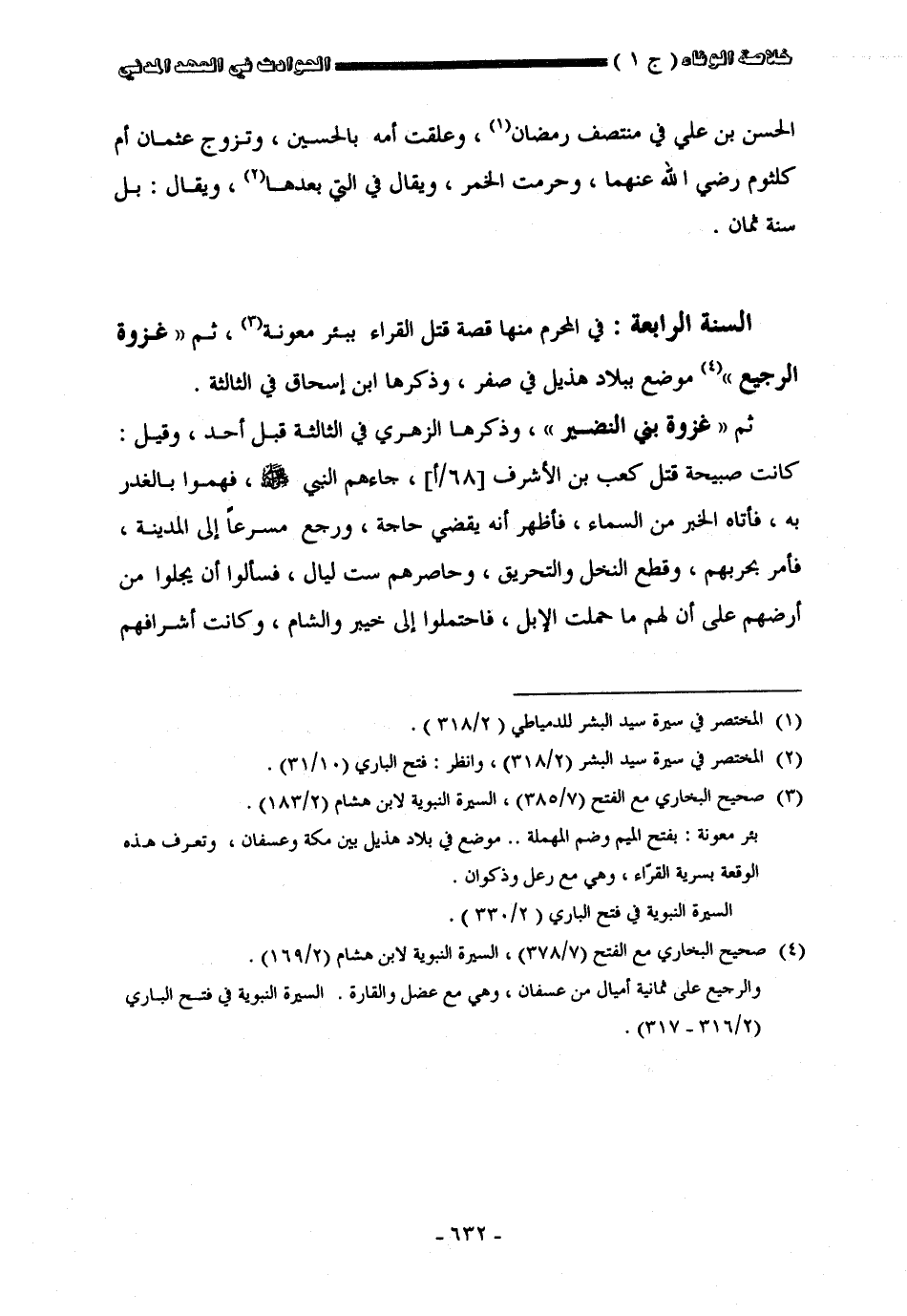 " السنة الرابعة ". في الحرم منها قصة قتل القراء ببئر معونة ثم غزوة الرجيع موضع ببلاد هذيل في صفر وذكرها أبن إسحاق في الثالثة ثم غزوة بني النظير وذكرها الزهري في الثالثة قبل أحد وقيل كانت صبيحة قتل كعب بن الأشرف جاءهم النبي صلى الله عليه وسلم فهموا بالغدر به فأتاه الخبر من السماء فأظهر أنه يقضي حاجة ورجع مسرعا إلى المدينة فأمر بحربهم وقطع النخل والتحريق وحاصرهم ست ليال فسألوا أن يجلوا من أرضهم على أن لهم ما حملت الإبل فاحتملوا إلى خيبر والشام وكانت أشرافهم