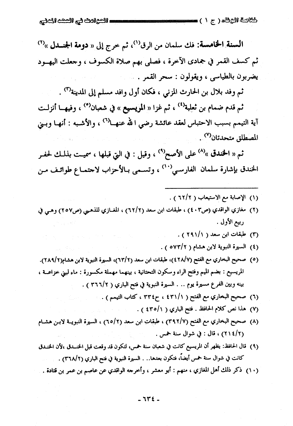 " السنة الخامسة " فك سلمان من الرق ثم خرج إلى دومة الجندل ثم كسف القمر في جمادى الآخرة فصلى بهم صلاة الكسوف وجعلت اليهود يضربون بالطساس ويقولون سحر القمر ثم وفد بلال بن الحرث المزنيّ فكان أوّل وافد مسلم إلى المدينة ثم قدم ضمام بن ثعلبة ثم غزا المريسيع في شعبان وفيها أنزلت آية التيمم بسبب الاحتباس لعقد عائشة رضي الله عنها والأشبه أنها وبني المصطلق متحدتان ثم الخندق على الأصح وقيل في التي قبلها سميت بذلك الحفر الخندق بإشارة سلمان الفارسي وتسمى بالأحزاب لاجتماع طوائف من
