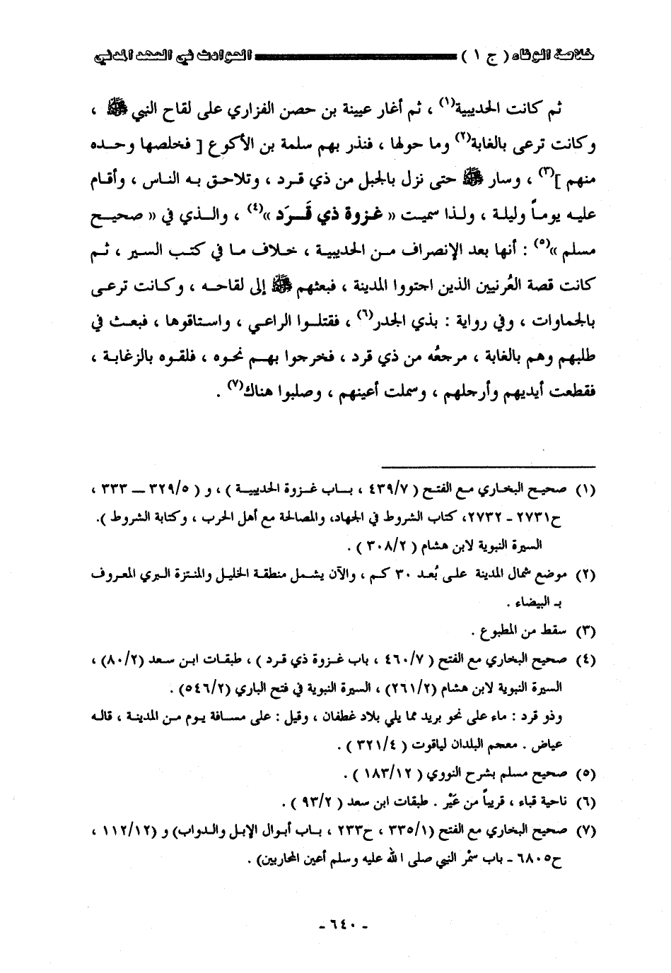 ثم كانت الحديبية ثم أغار عينة بن حصن الفيزاري على لقاح النبي صلى الله عليه وسلم وكانت ترعى بالغابة وما حولهم فنذر بهم سلمة بن الأكوع وسار صلى الله عليه وسلم حتى نزل بالجبل من ذي قرد وتلاحق به الناس وأقام عليه يوما وليلة ولذا سميت غزوة ذي قرد والذي في صحيح مسلم أنها بعد الانصراف من الحديبية خلاف ما في كتب السير ثم كانت قصة العرنين الذين اجتروا المدينة فبعثهم صلى الله عليه وسلم إلى لقاحه وكانت ترعى بالجماوين وفي رواية بذي الجد فقتلوا الراعي واستاقوها فبعث في طلبهم وهو بالغاية مرجعه من ذي قرد فخرجوا بهم نحوه فلقوه بالزغابة فقطعت أيديهم وأرجلهم وسملت أعينهم وصلبوا هناك.